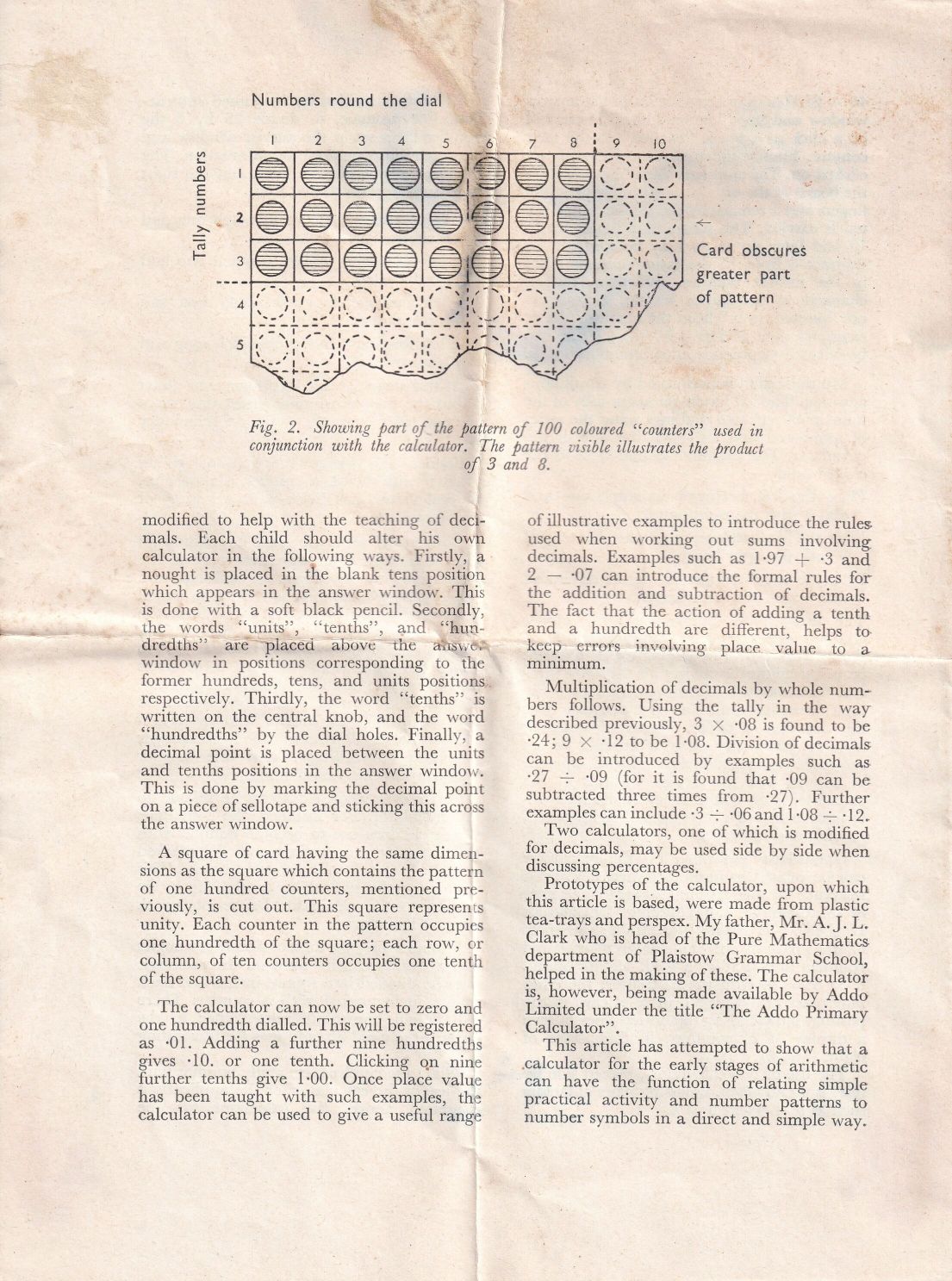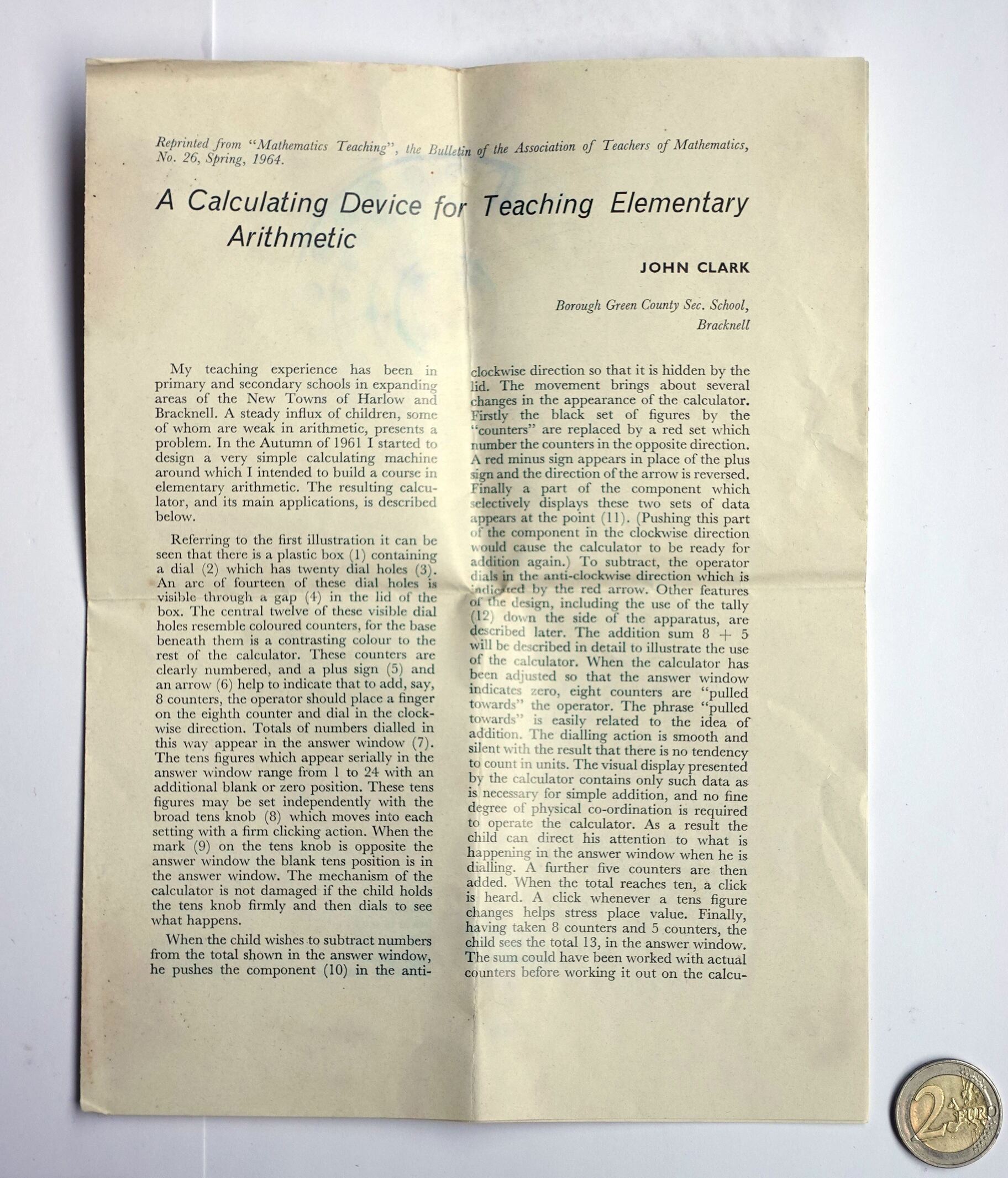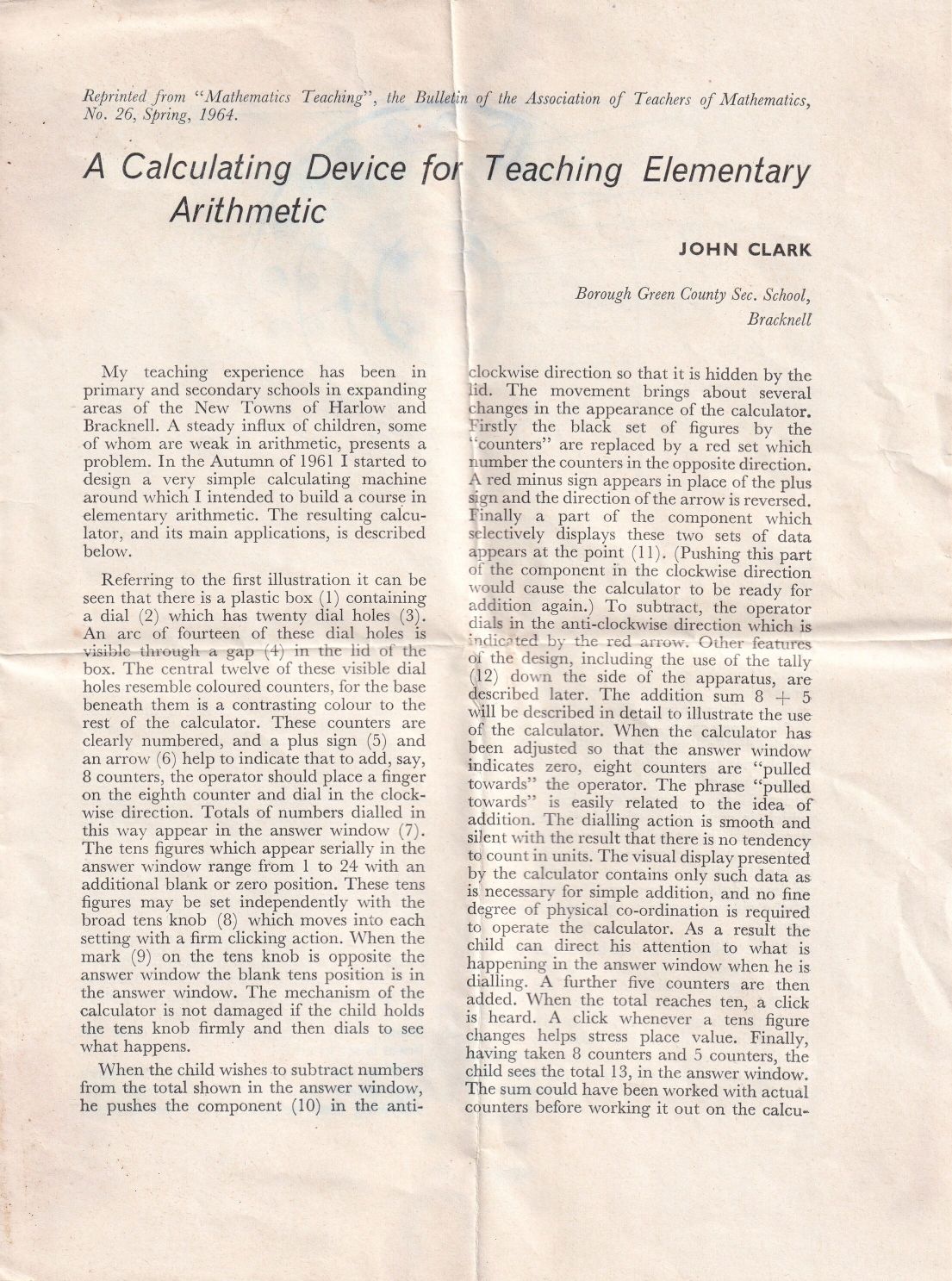 Also included was a reprint of an article from the Spring 1964 issue of Mathematics Teaching, written by the inventor of the adder, John Arnold Clark. (PDF, 3.50 MB or archive.org)
