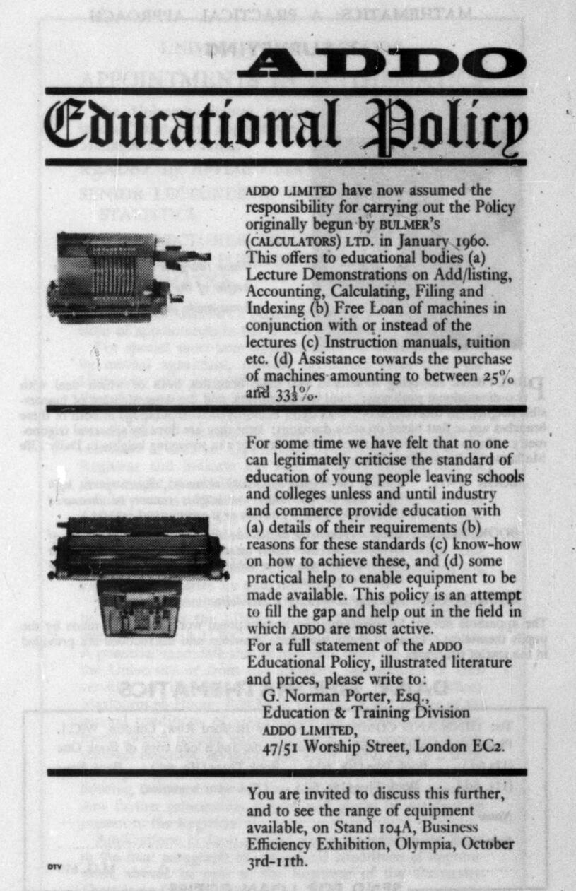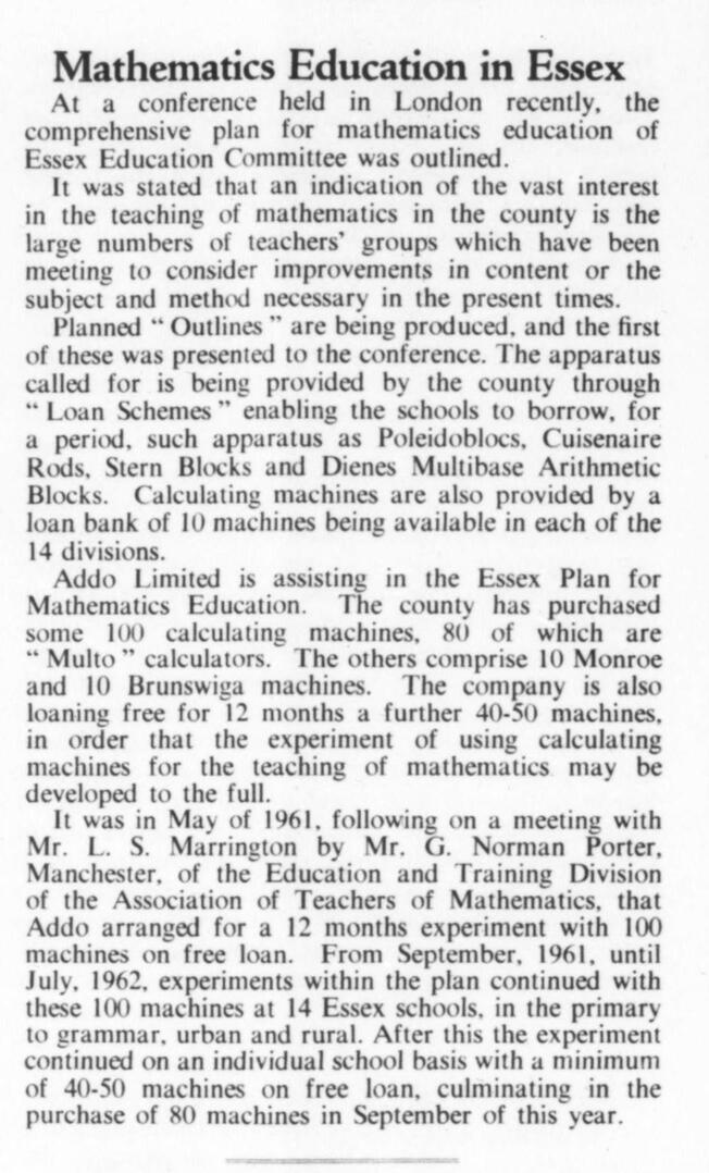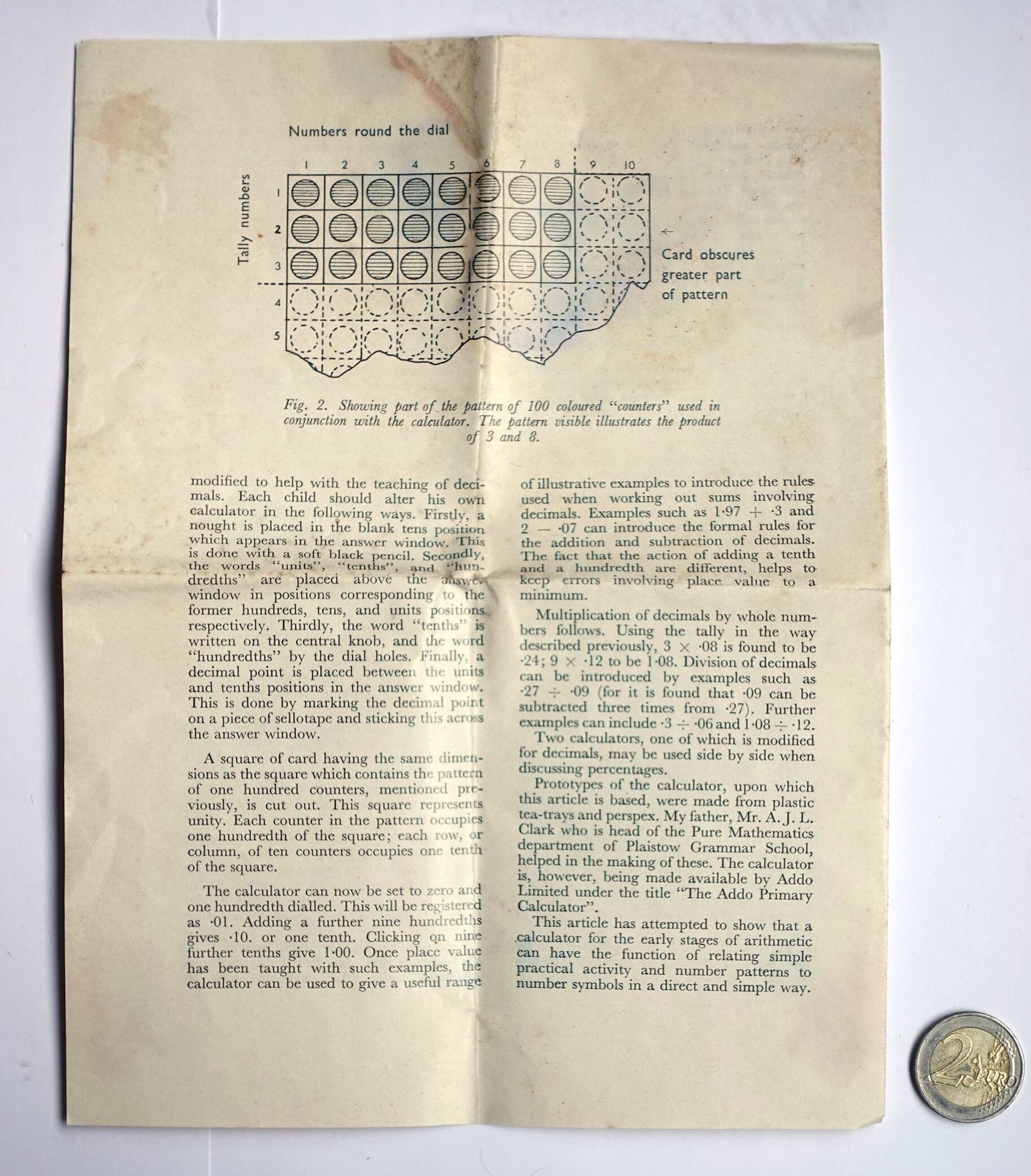 Also included was a reprint of an article from the Spring 1964 issue of Mathematics Teaching, written by the inventor of the adder, John Arnold Clark. (PDF, 3.50 MB or archive.org)