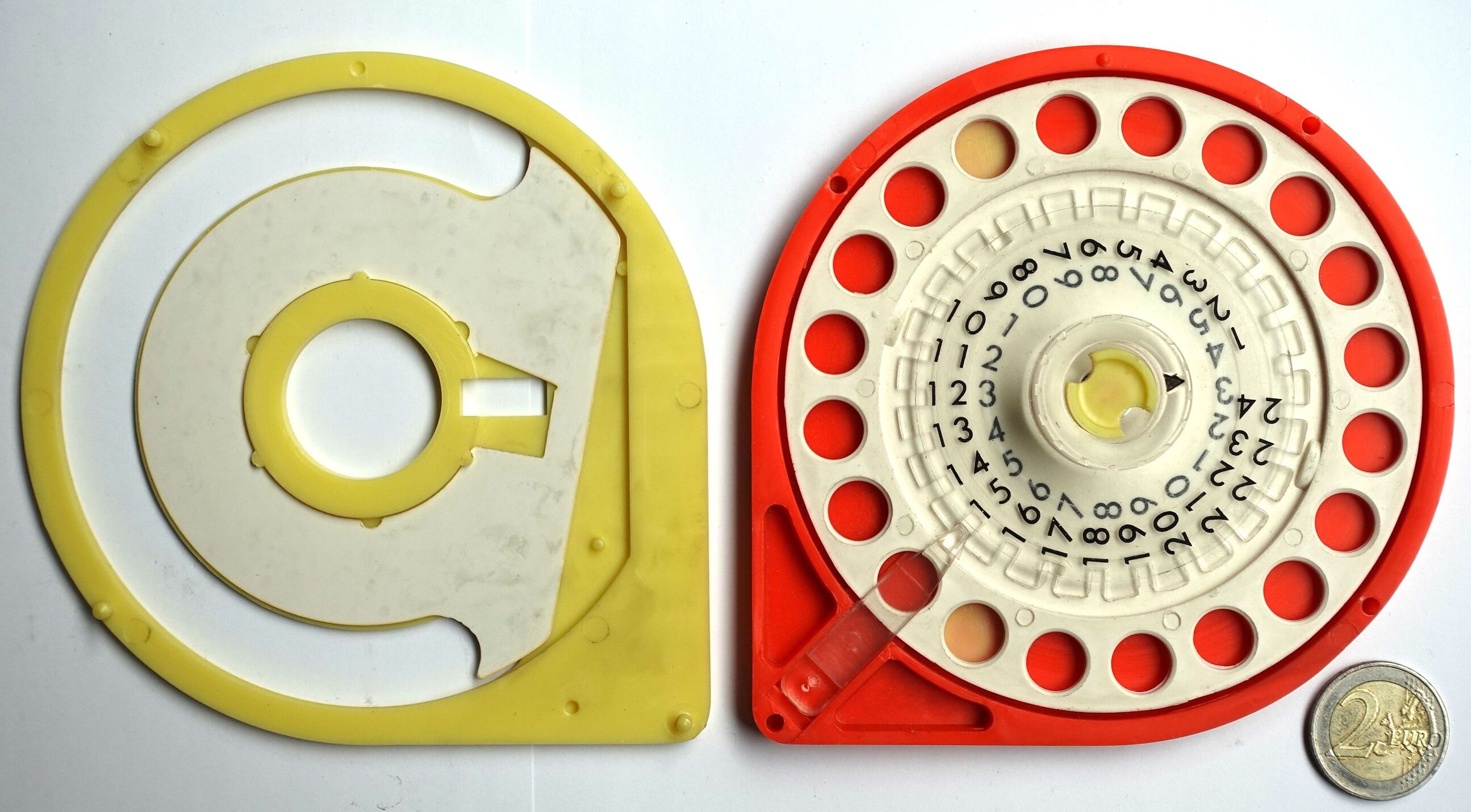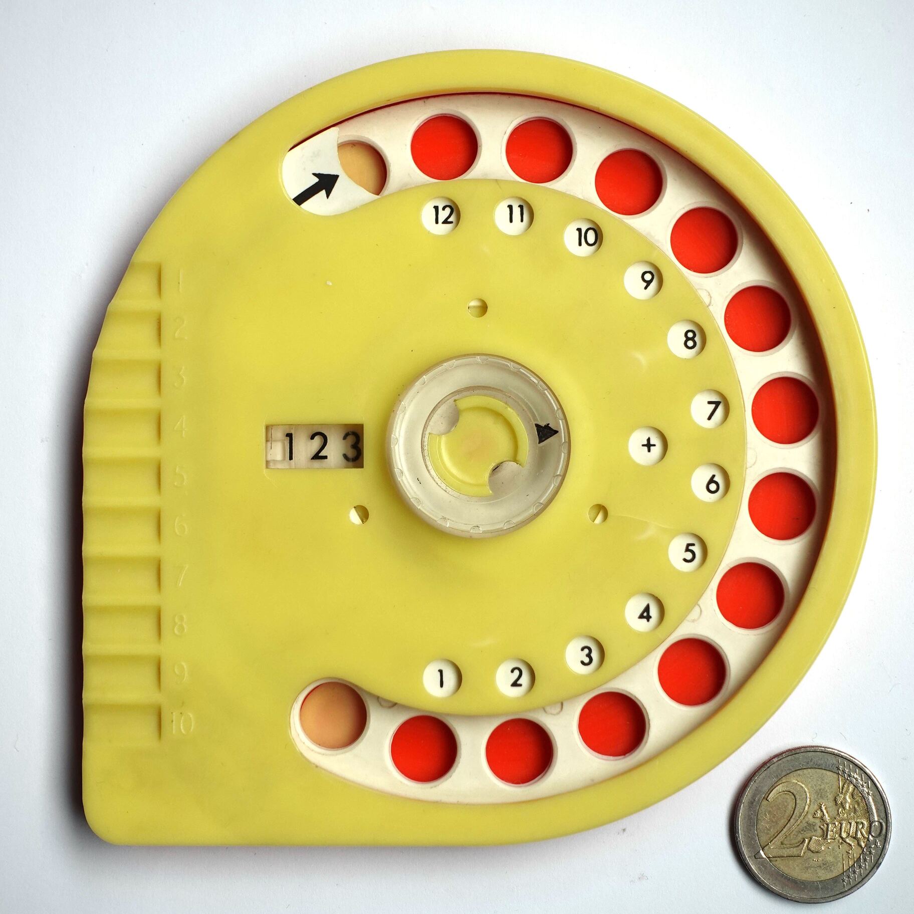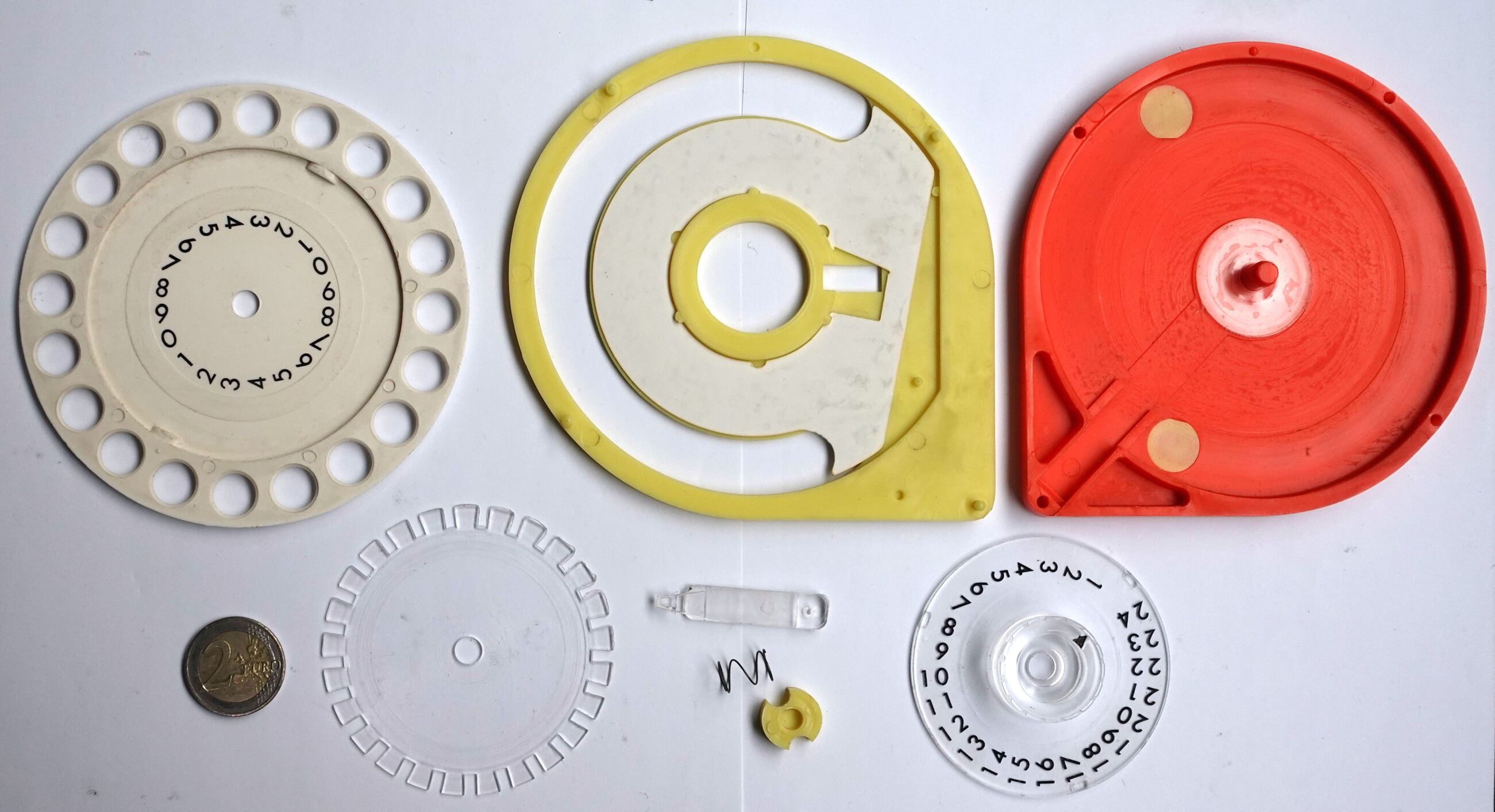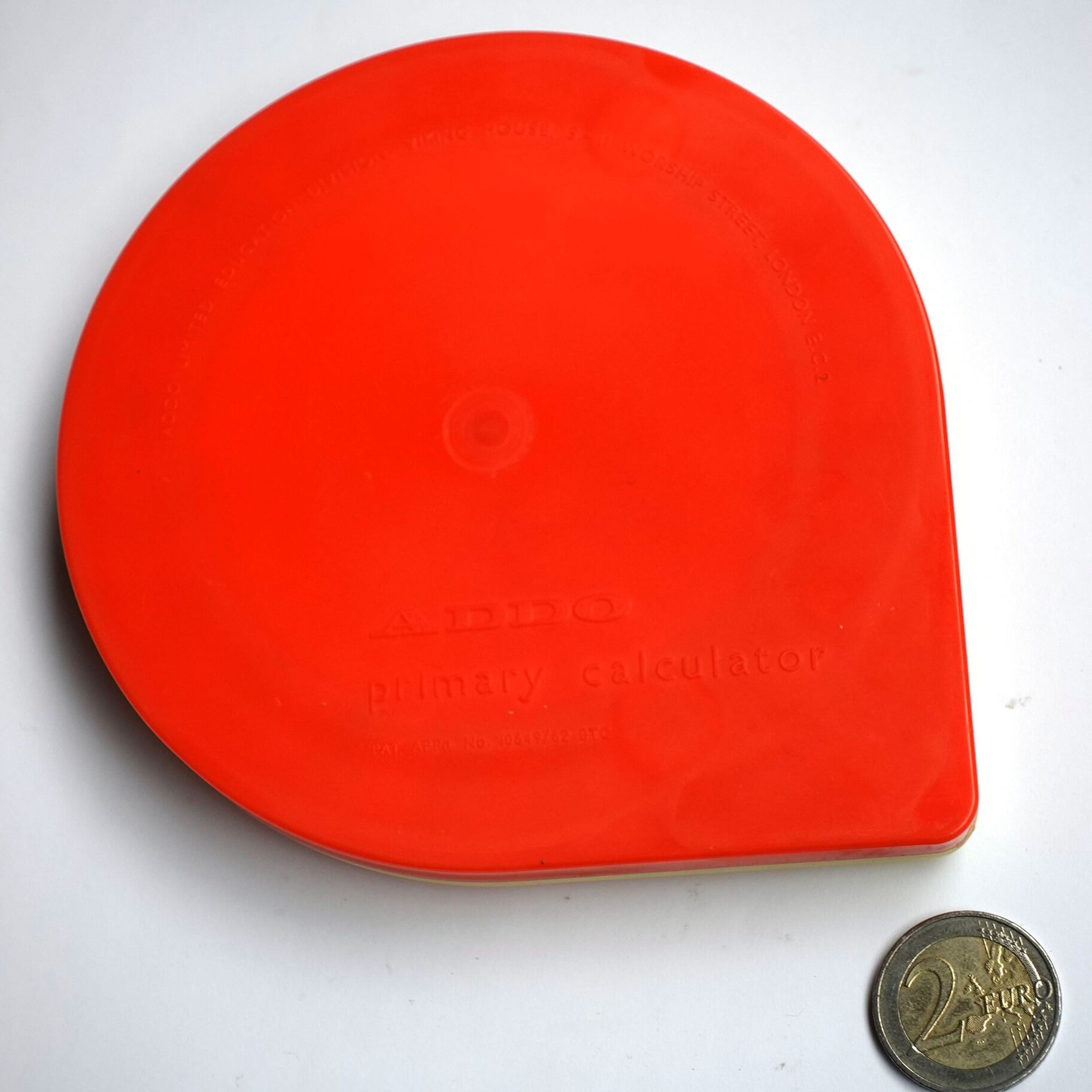 The Primary Calculator is an educational toy adder. It consists of a flat plastic frame enclosing a disc. There is a wide curved slot that exposes fingerholes in the disc with which it can be turned like a rotary phone dial. On the left is a small window that shows a 3-digit register. The units digit of the register is printed on that main disc, but the tens and hundreds digits are on a smaller transparent disc, overlaying the main one concentrically, and which can be turned using the central knob.