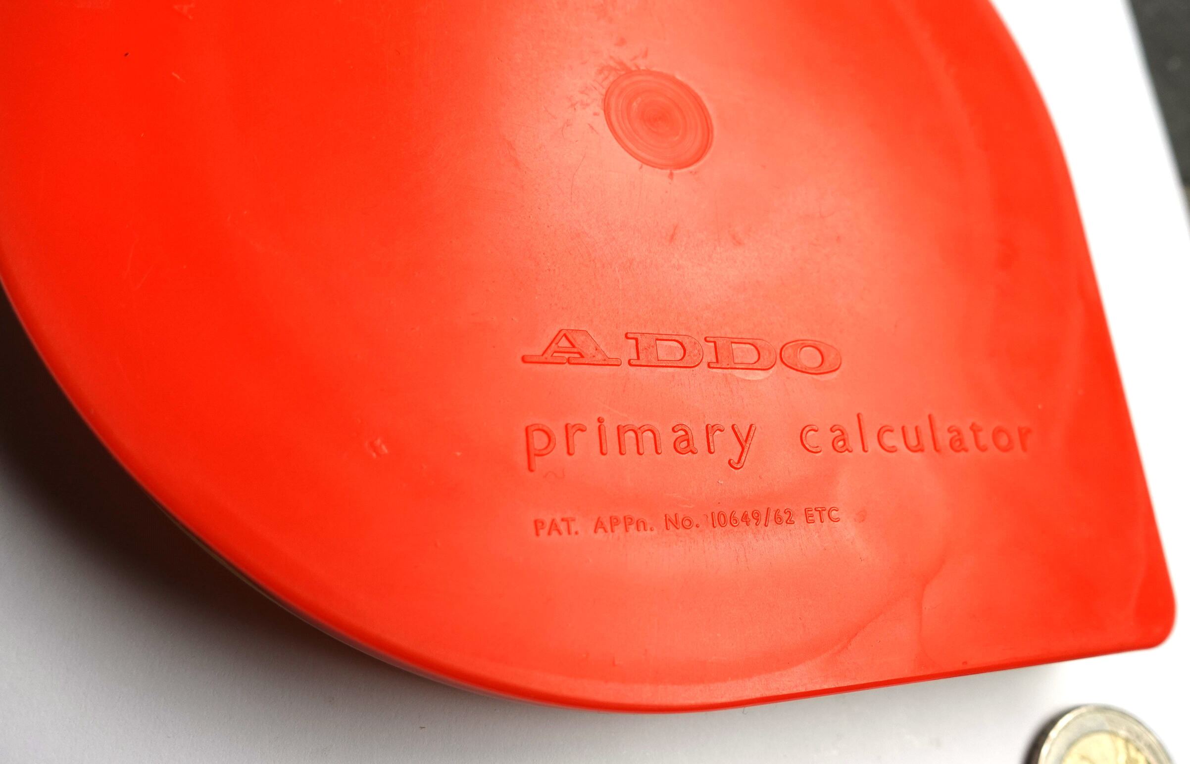 The ADDO Primary Calculator consists basically of a plastic "box" (A) containing a "dial" with 20 finger holes, (B). An arc cut out of the "lid" of the box makes a proportion of the dial holes visible and operable by the forefinger (as in a telephone dial). (C) Adjacent to the dial holes are numbers from 1-12 (D)—in BLACK with an arrow pointing towards the operator (clockwise) for addition and multiplication and in RED with an arrow pointing away from the operator (anticlockwise) for subtraction and division. The process is also indicated by a Black plus (+) or a Red minus (-) sign (E) as appropriate. Down the left hand edge are a number of depressions, or tallies (F), numbered from 1-10 to assist the memory in recording the number of operations performed—or "count". Finally the central knob may be "lifted" and turned in either direction to "set" figures or return figures to zero in the answer window. (H) The black indented arrow on the central knob points towards the answer window (i.e. in the "9 o'clock" position) when the "tens" and "hundreds" figures are clear.