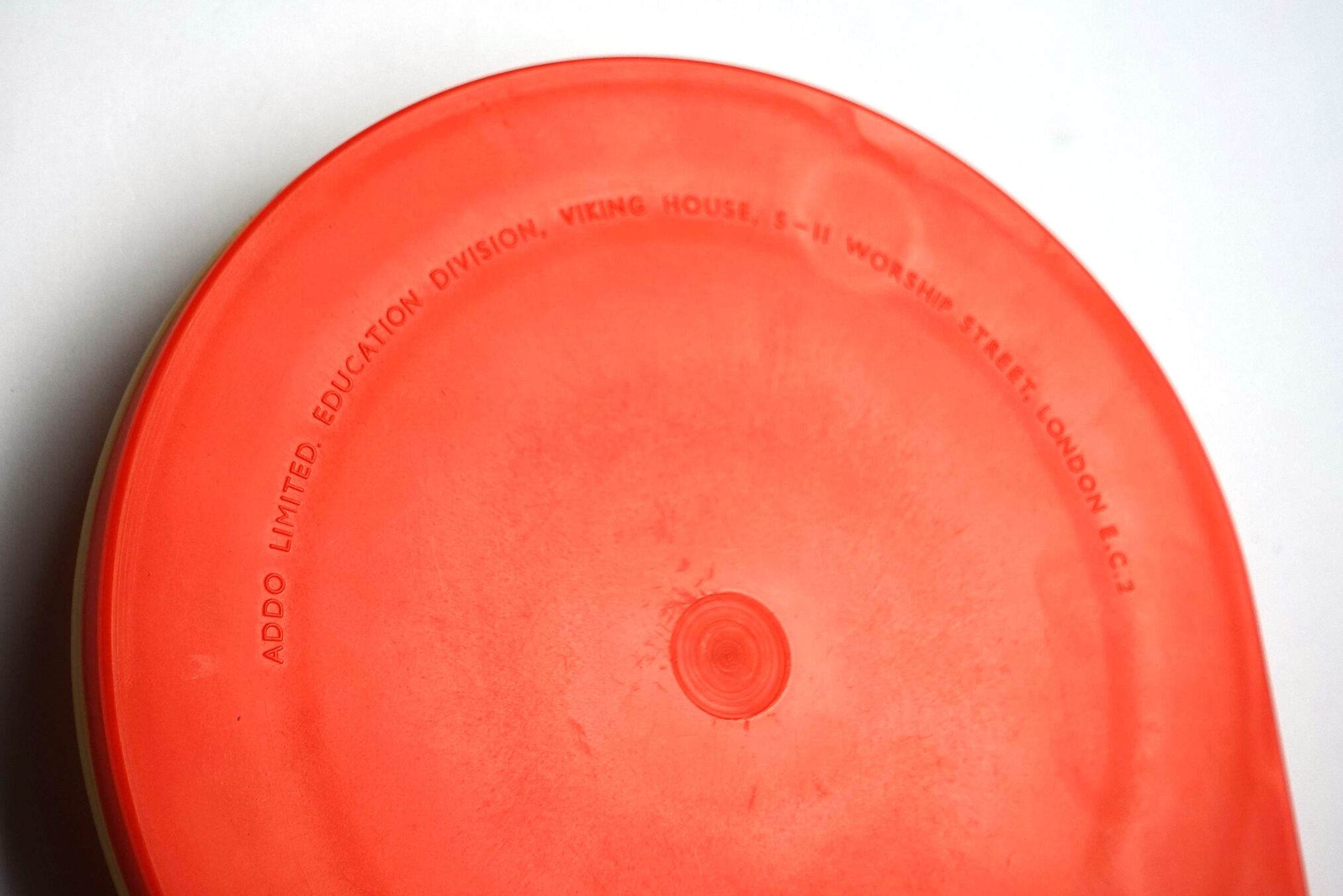 This adder was invented by John Arnold Clark and made by the Education and Training Division of Addo Limited, the British branch of Addo. It was probably made around 1964 or 1965. The carry mechanism is very simple. The tens disk is held in place by a tooth, and during the carry a little bump on the units disc pushes the tooth out of the way, allowing the tens disc to be carried along with the units disc by friction. This is in fact the same mechanism as used in Hart's Mercantile Computing Machine from 1878.