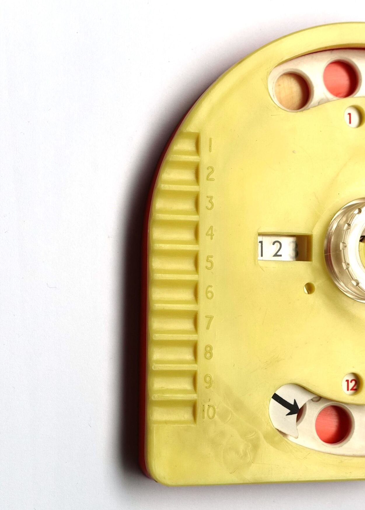 The fingerholes are labelled 1 to 12, and there is an arrow to show the direction in which to dial. Dialling a number will add that number to the total shown in the register up to a maximum of 249. Carries are performed automatically. The labels and arrow are printed on a sheet that can be shifted to go into subtract mode, and then the labels change to red and are numbered in the opposite order, and the arrow goes the opposite way. Dialling a number in this direction will subtract it from the total.