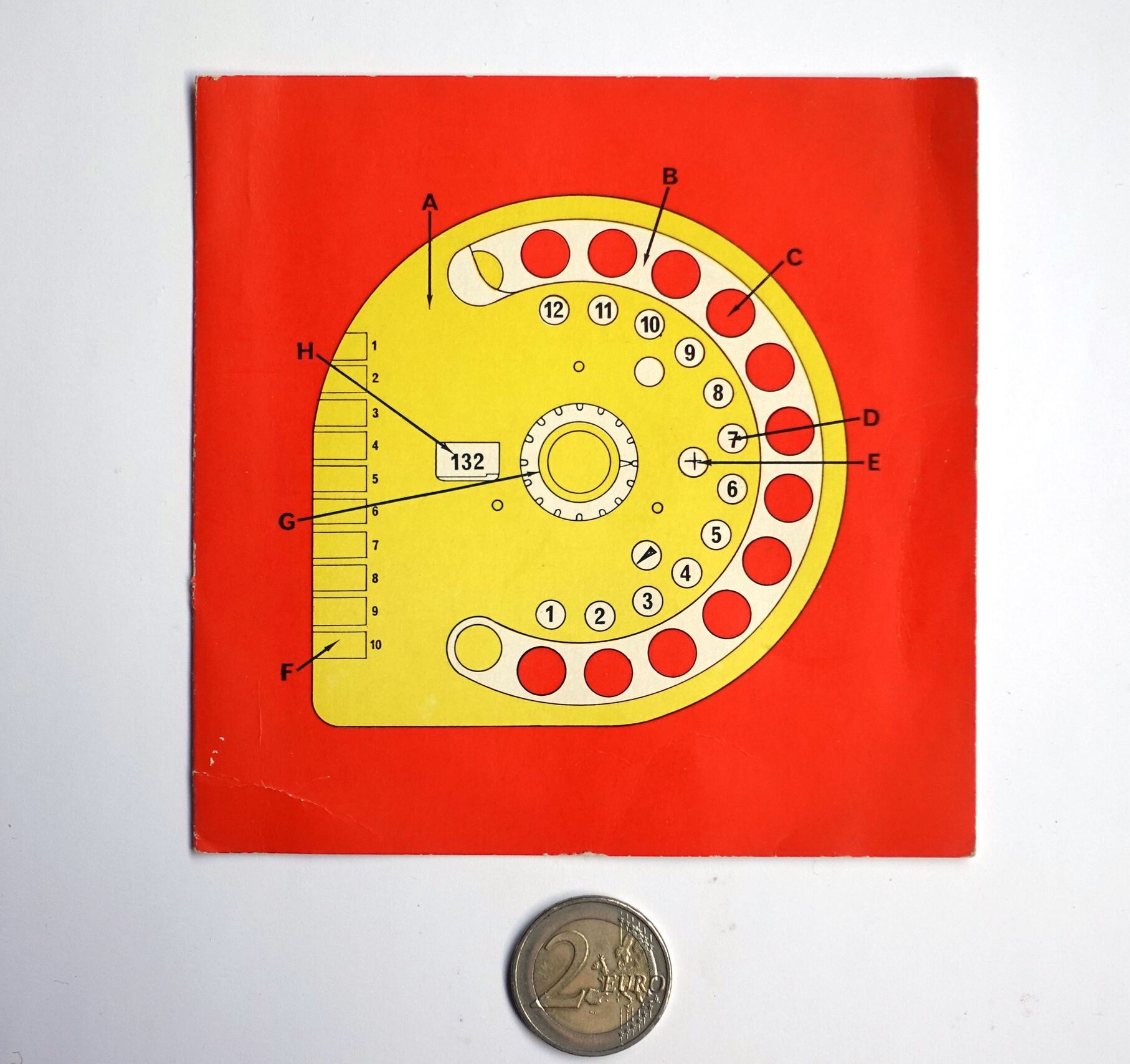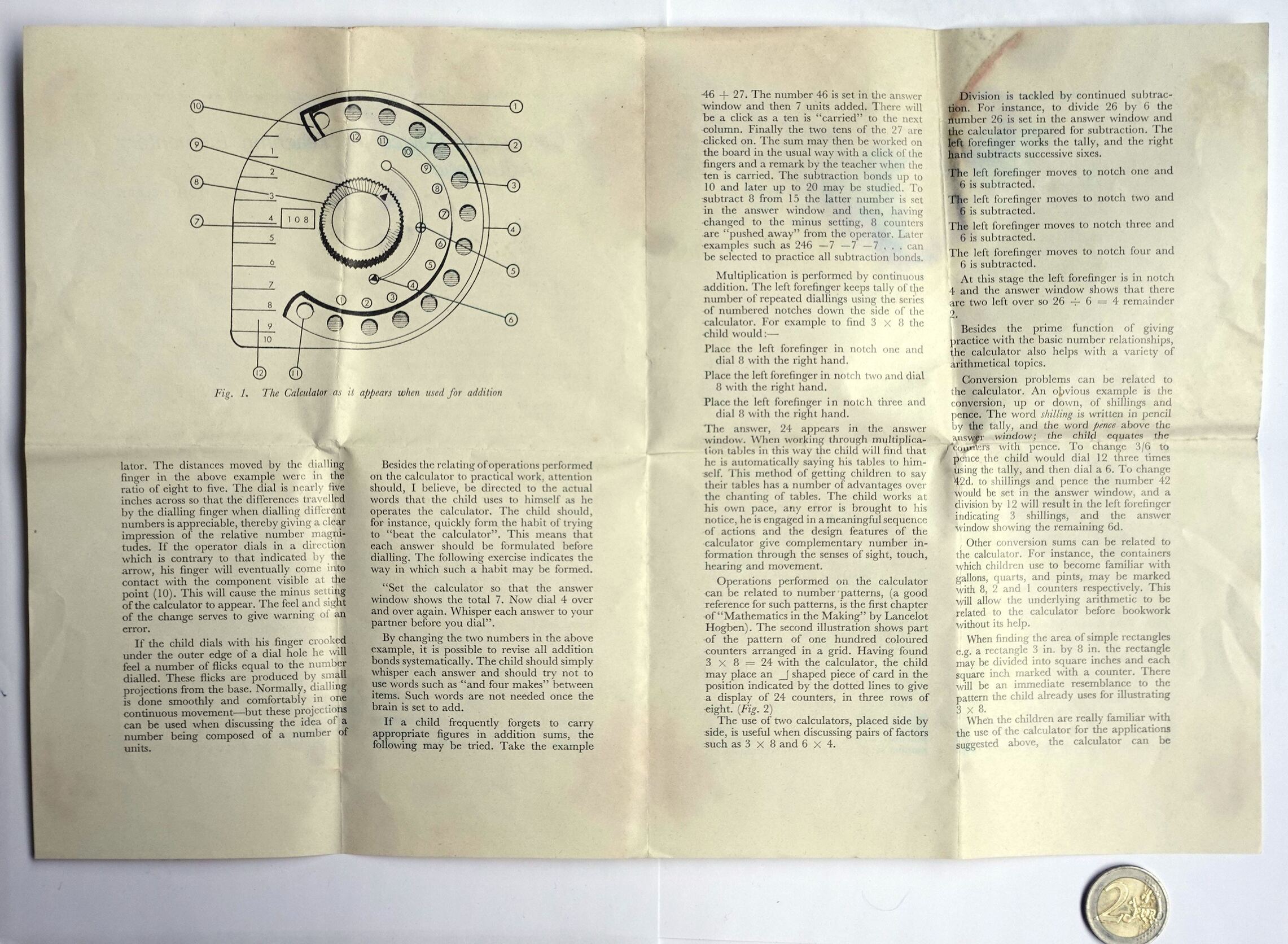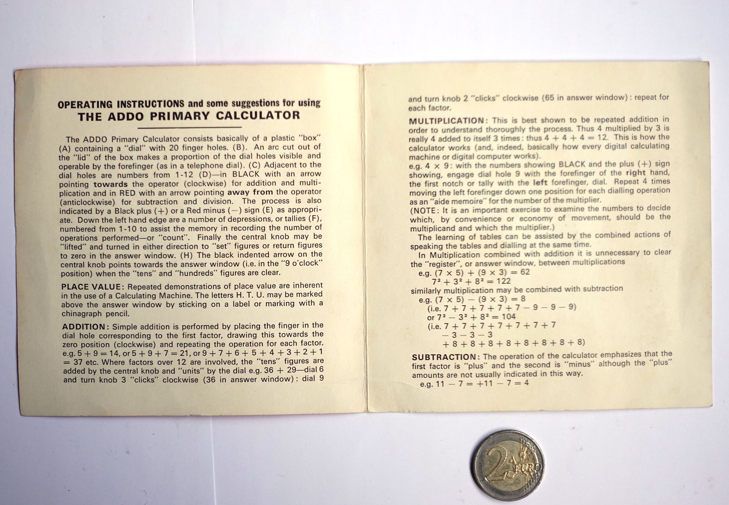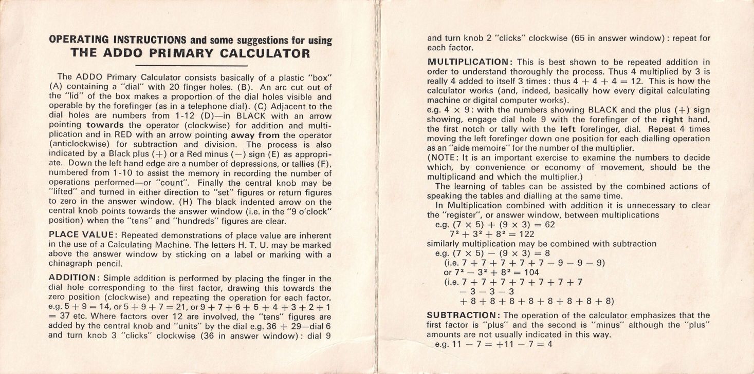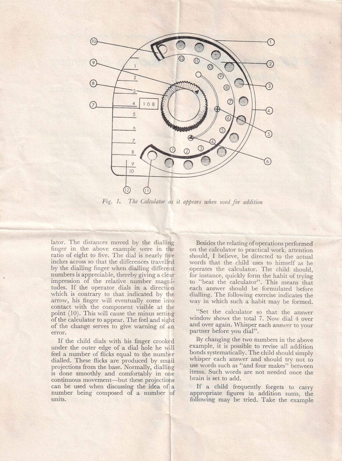 ADDITION: Simple addition is performed by placing the finger in the dial hole corresponding to the first factor, drawing this towards the zero position (clockwise) and repeating the operation for each factor. e.g. 5 + 9 = 14, or 5 + 9 + 7 = 21, or 9 + 7 + 6 + 5 + 4 + 3 + 2 + 1 = 37 etc. Where factors over 12 are involved, the "tens" figures are added by the central knob and "units" by the dial e.g. 36 + 29—dial 6 and turn knob 3 "clicks" clockwise (36 in answer window): dial 9 and turn knob 2 "clicks" clockwise (65 in answer window): repeat for each factor.