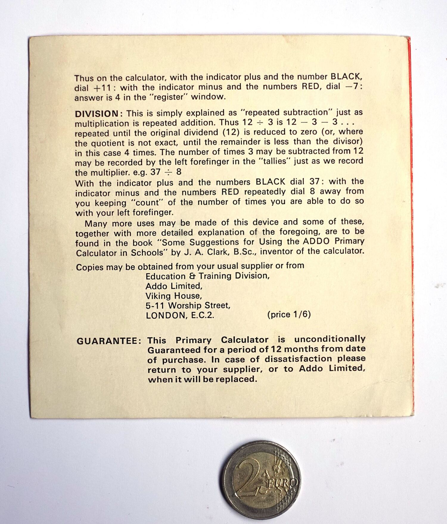 | GUARANTEE: | This Primary Calculator is unconditionally Guaranteed for a period of 12 months from date of purchase. In case of dissatisfaction please return to your supplier, or to Addo Limited, when it will be replaced. |