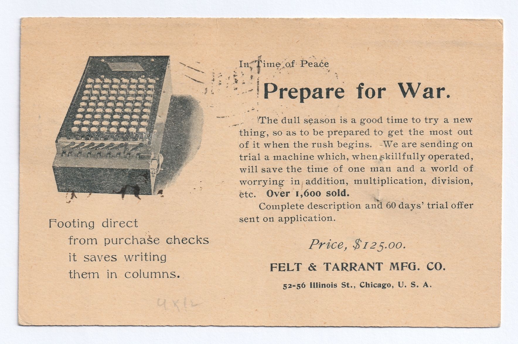 postal card with preprinted 2 cent stamp. The advert promotes the Comptometer and like most of the