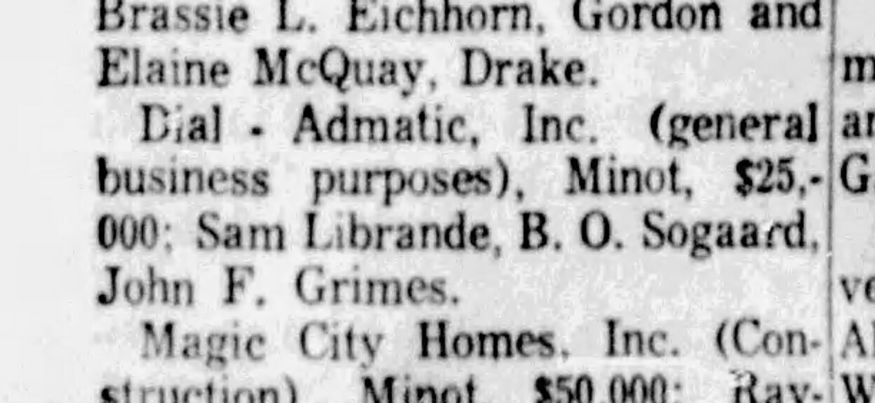 The rear of the machine bears the text "Dial-Admatic, Inc. Minot, No. Dak. Pat. Pend.". It was invented by Samuel M. Librande, also of Minot, North Dakota, and he filed for a patent in May 1964 which was granted February 1966. It was used in a few supermarket chains from the end of 1964, but seems to have been very short-lived.