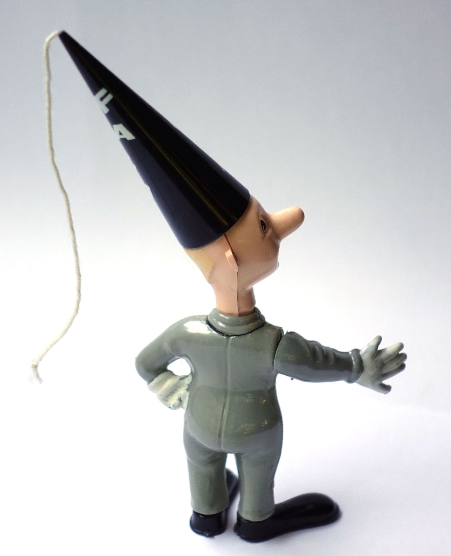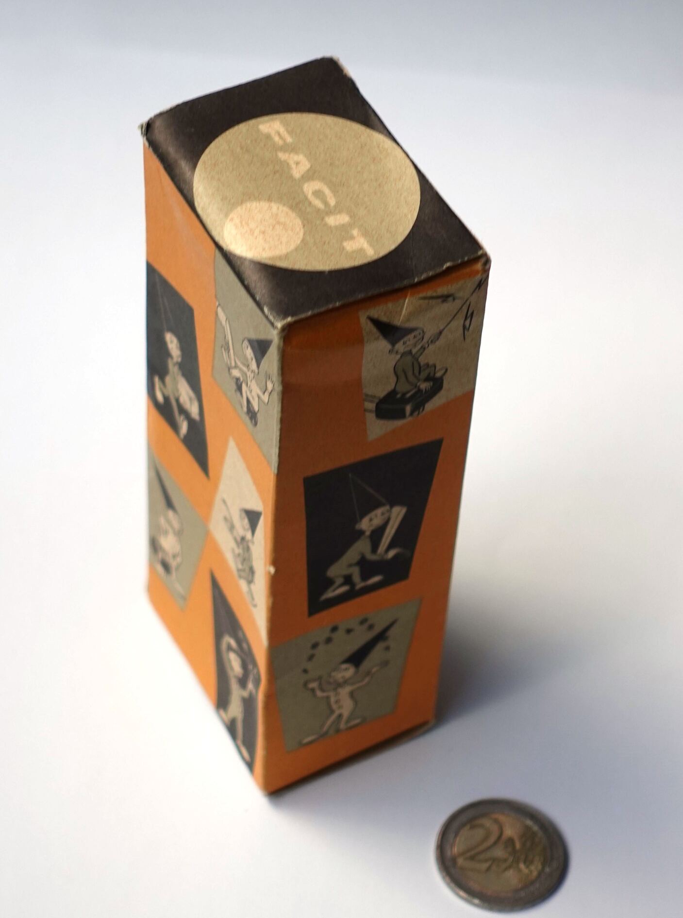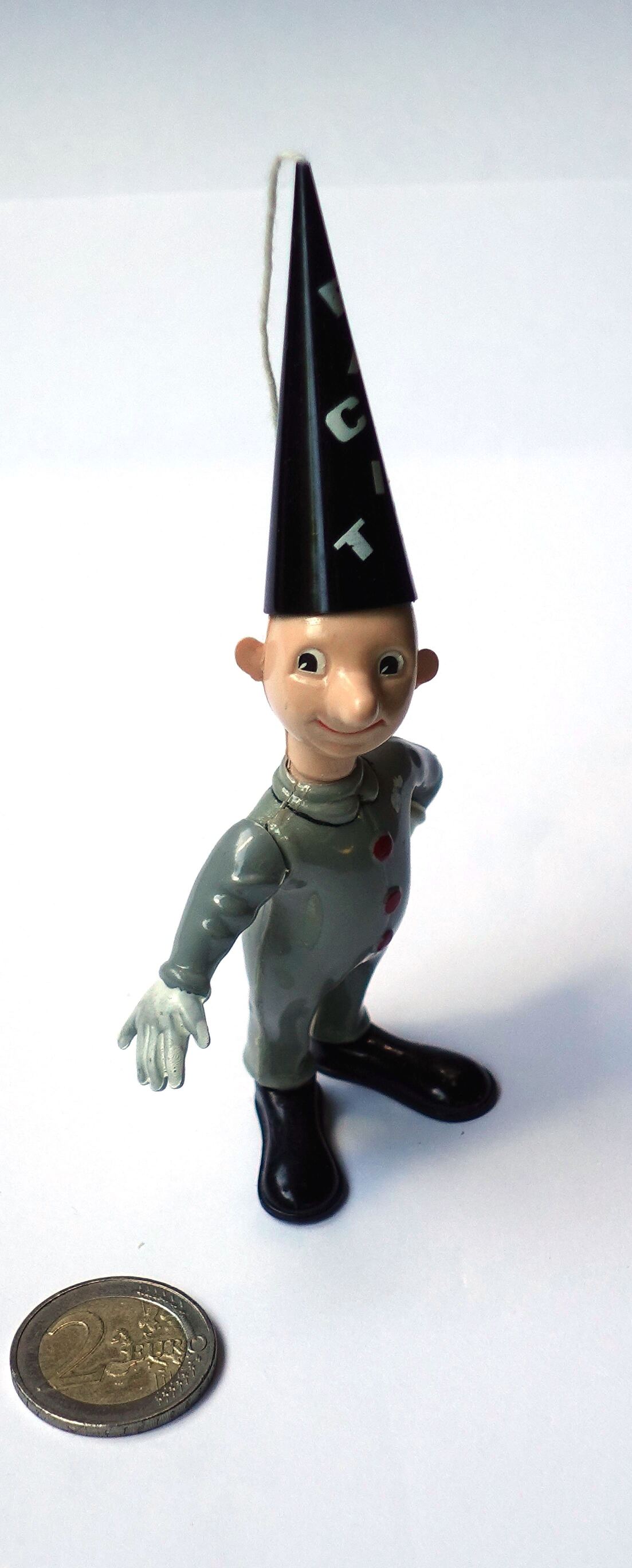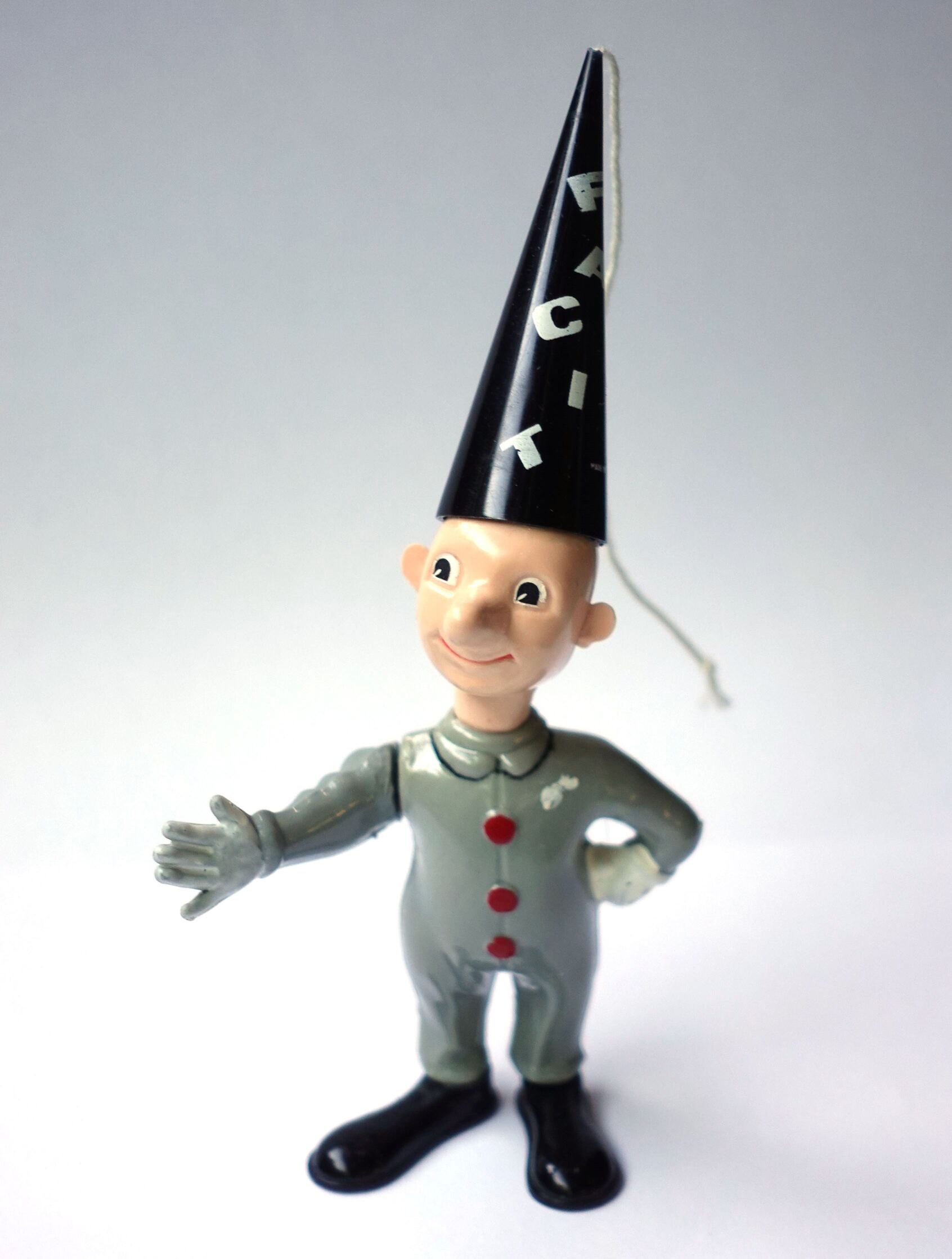 This is the Facit Wizard, the company's advertising mascot. This figure is made in plastic, has an articulated arm and head, and has (weak) magnets in its feet for extra stability. It comes with its original cardboard box.