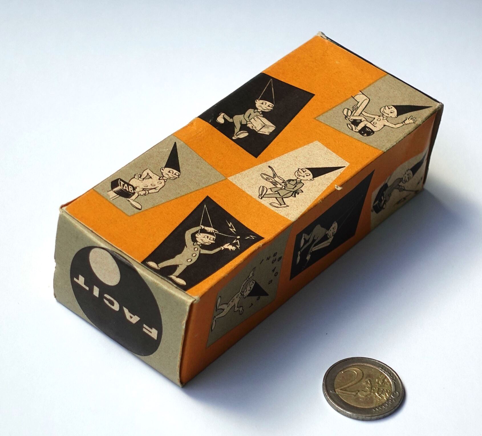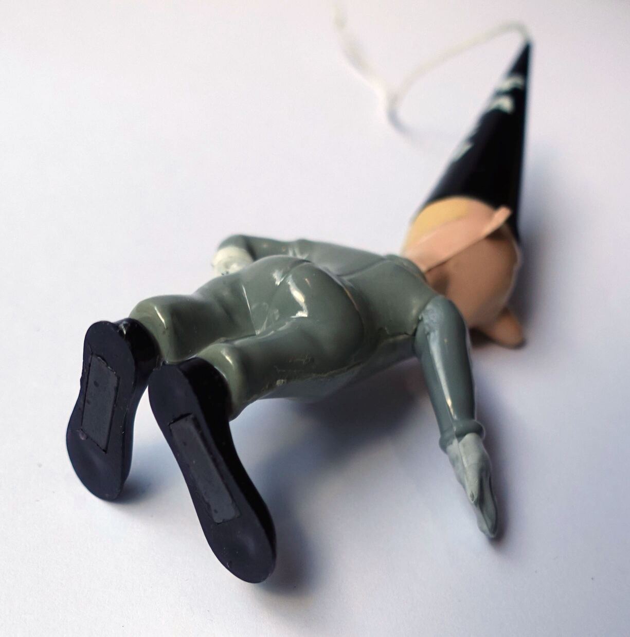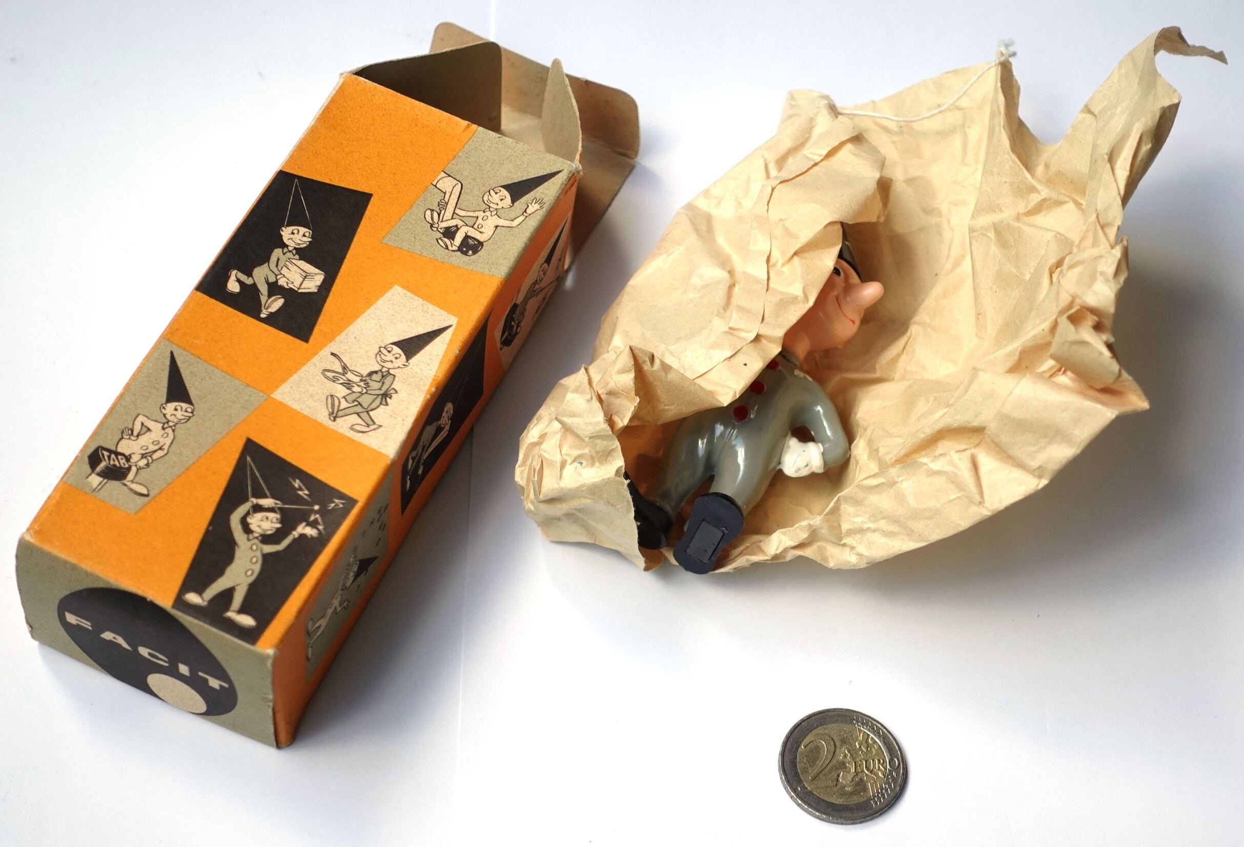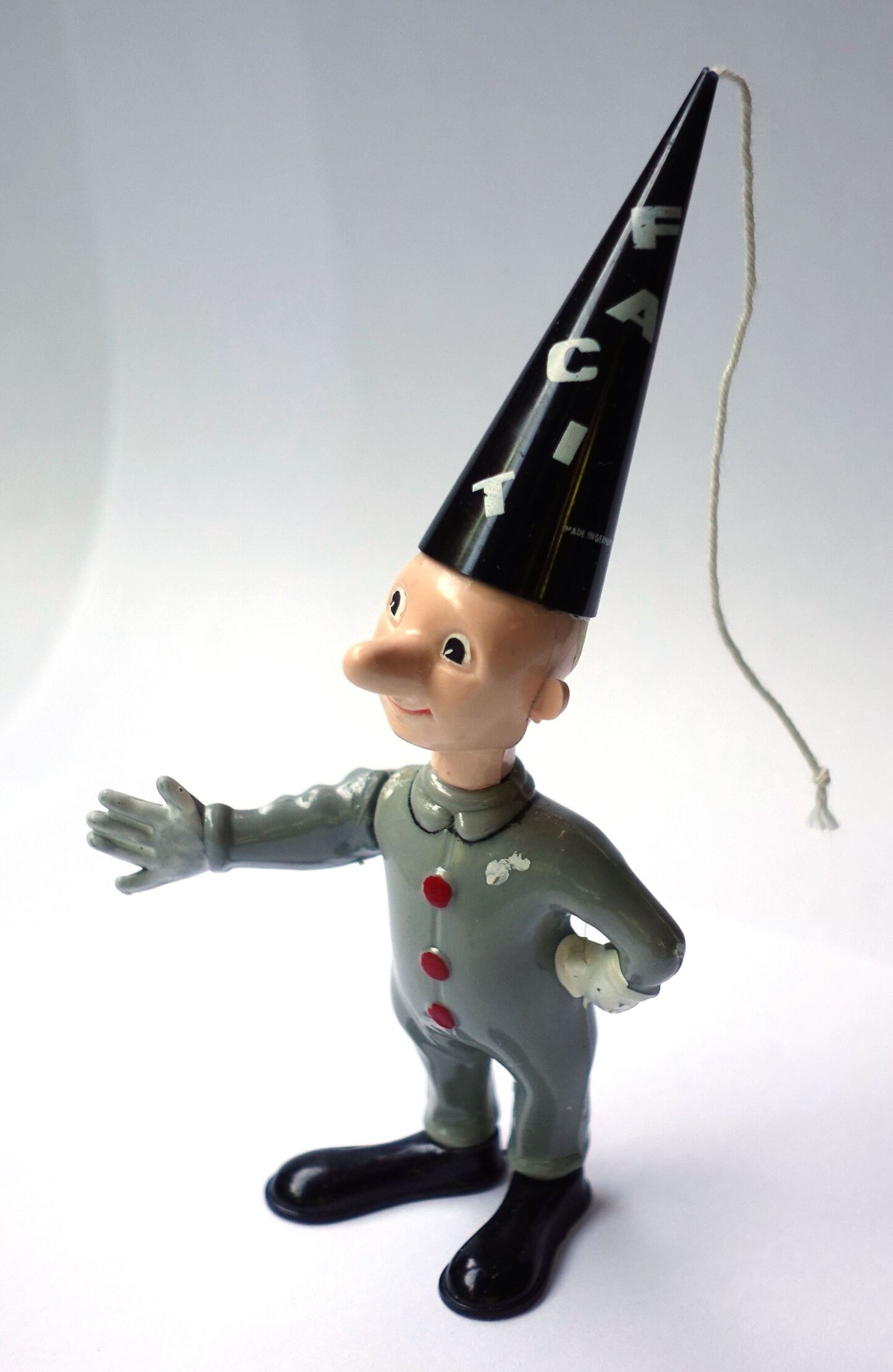 This is the Facit Wizard, the company's advertising mascot. This figure is made in plastic, has an articulated arm and head, and has (weak) magnets in its feet for extra stability. It comes with its original cardboard box.