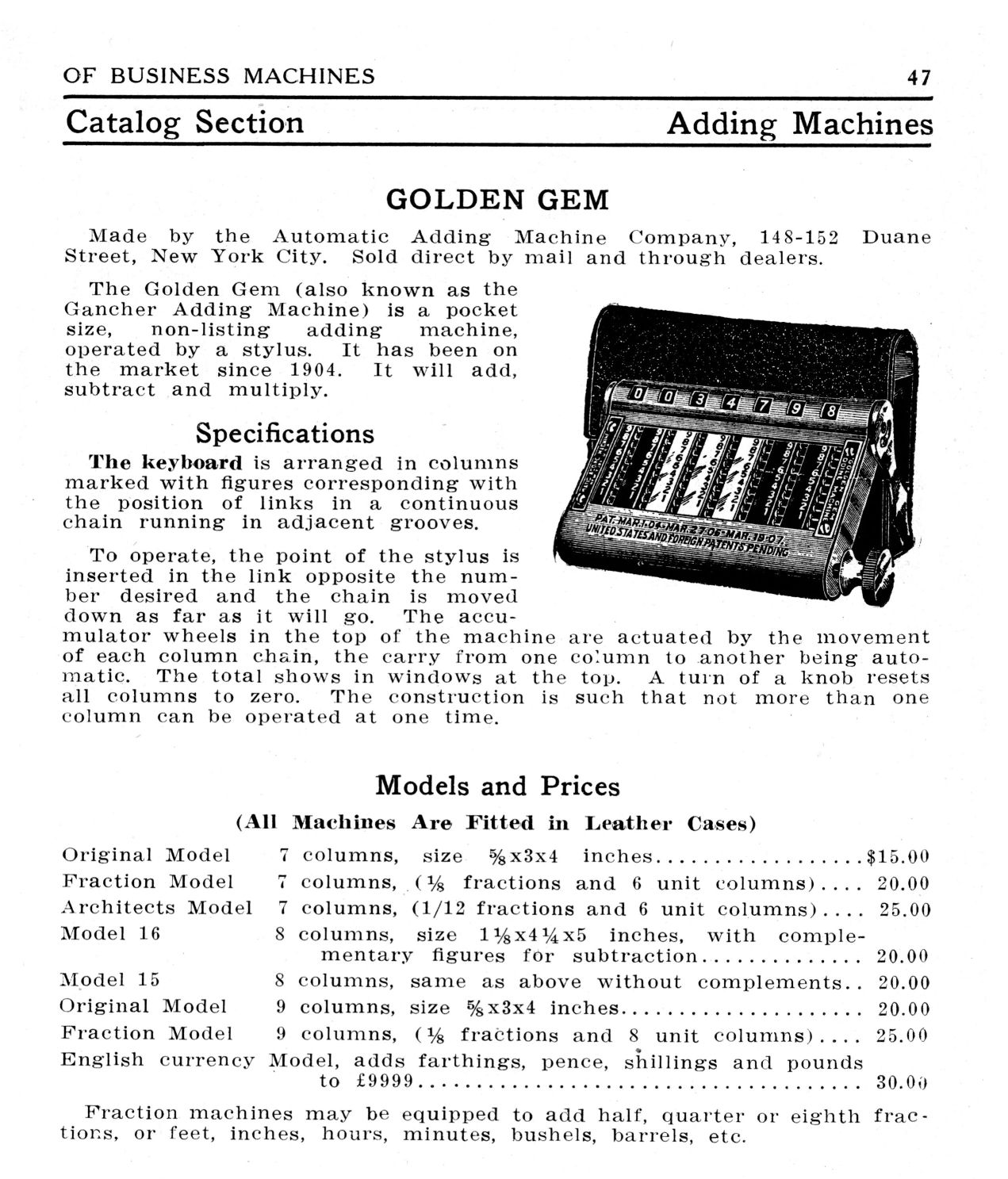 1906-07: "Gem" Adding Machine on the market. Has metal stand.