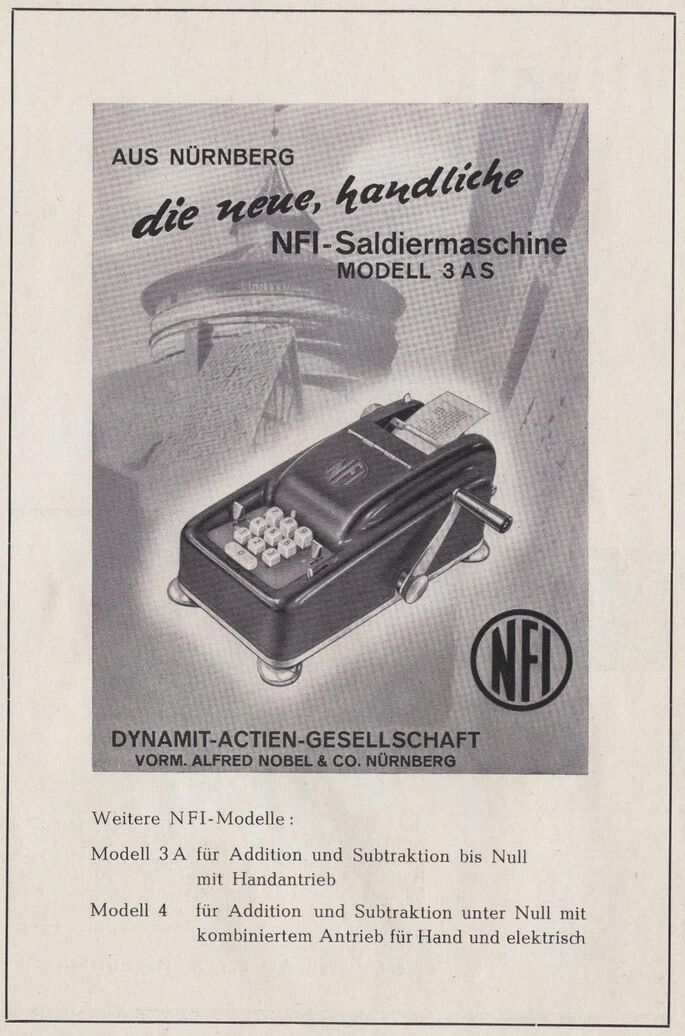 Meanwhile in Stadeln, near Nuremburg, a munitions manufacturing plant owned by Dynamit AG (formerly Alfred Nobel & Co) had been dismantled by the Americans, and mostly transported to Poland as reparations. In 1948 a legally independent company was founded from the remaining assets as the Nürnberg-Fürther Industriewerk, or NFI. They were looking for products to manufacture, and in September 1948 a deal was struck for Reinhard Rexin and some other former Mauser engineers to work for NFI and further develop Mauser's small adding machine, and for the patent rights to be transferred to NFI. Production began in April 1950. NFI also hosted production for many other companies on the large industrial site.