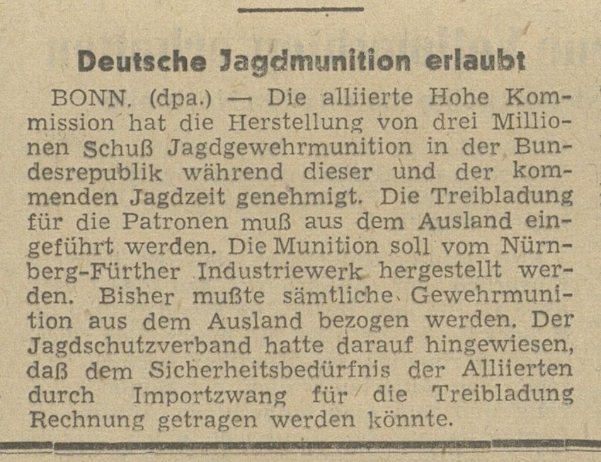 In 1952 the company could legally be reunited with the site's former owner, Dynamit AG based in Troisdorf, and it was renamed to Dynamit-Actien-Gesellschaft Nürnberg. Arms and munitions manufacturing was becoming legal again, though only limited to the consumer market, for hunting and sport. The company bagan to pivot back, so the manufacturing of other products was scaled back and halted as soon as the contracts expired. The production of adding machines ceased at the beginning of 1955.