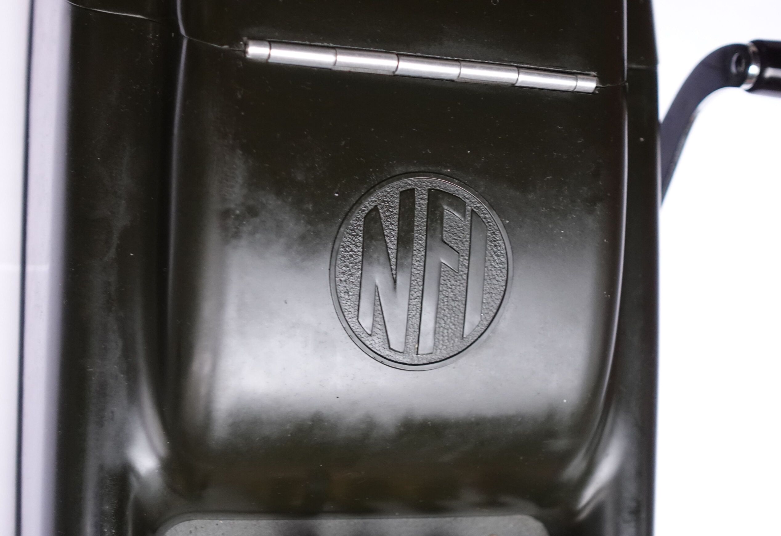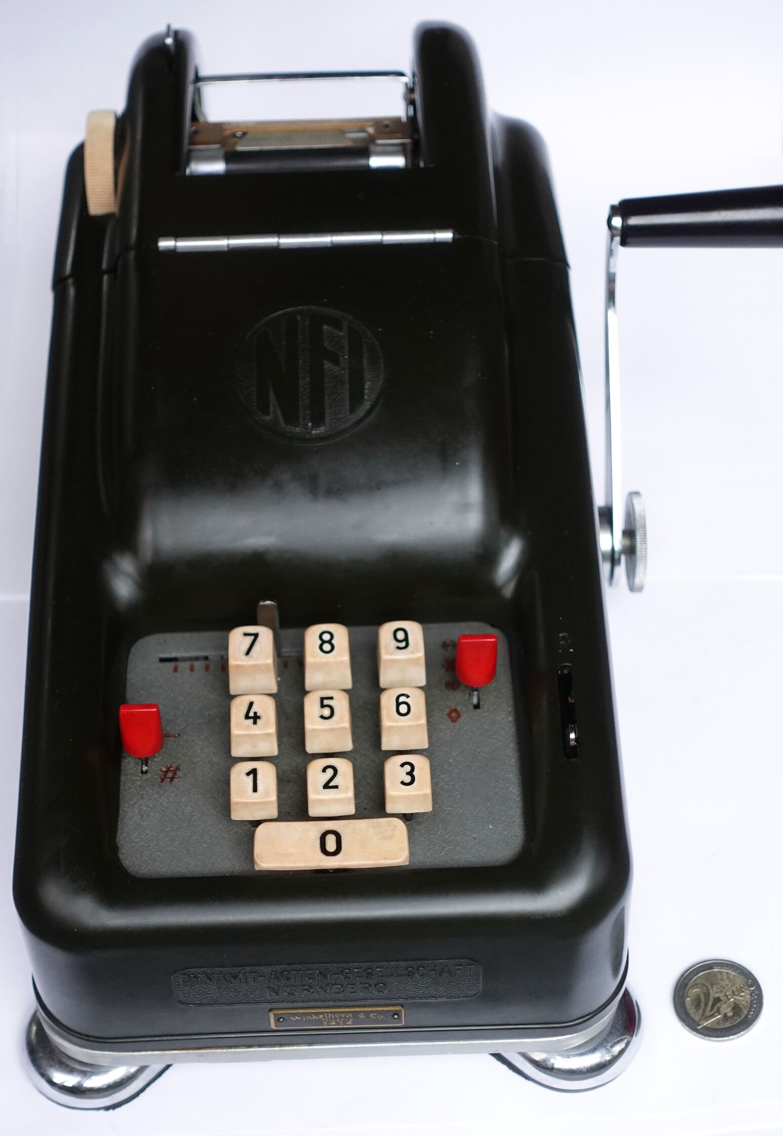 The NFI model 3A is a compact adding listing machine made in Germany from 1950 to 1954. It has a standard 10-key keyboard, allows input of 8-digit numbers, and its register is 9 digits in size. It can add and subtract, but does not handle negative totals.
