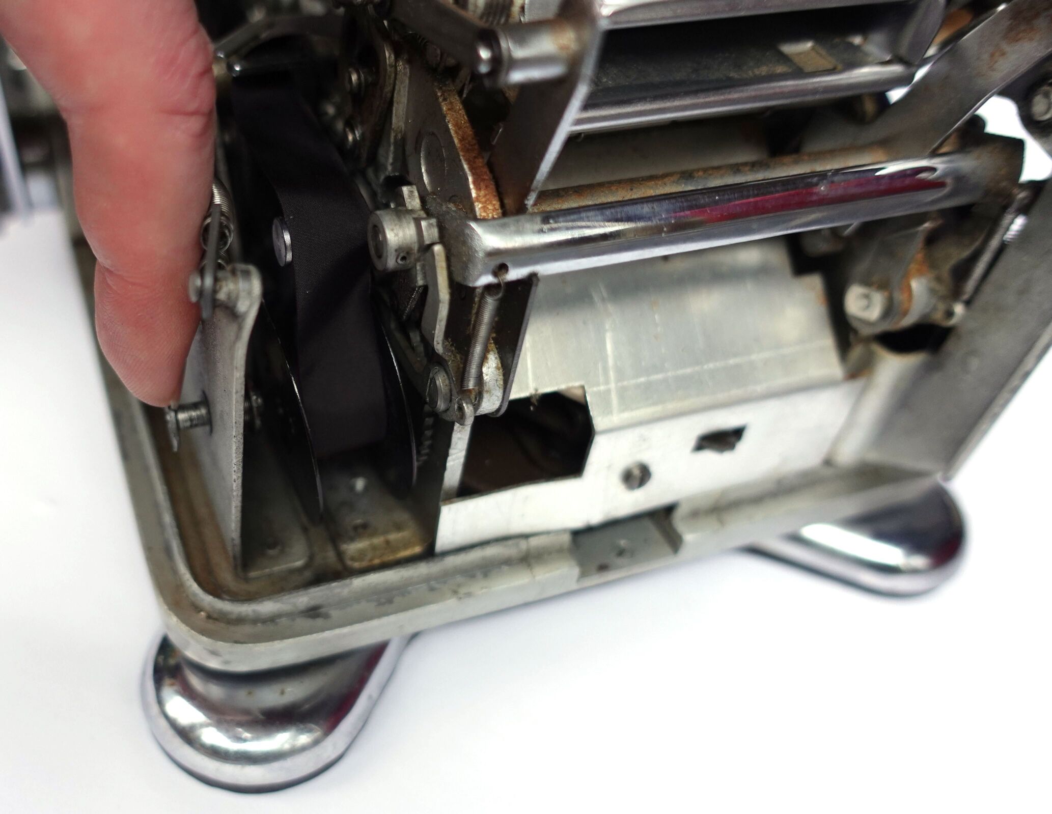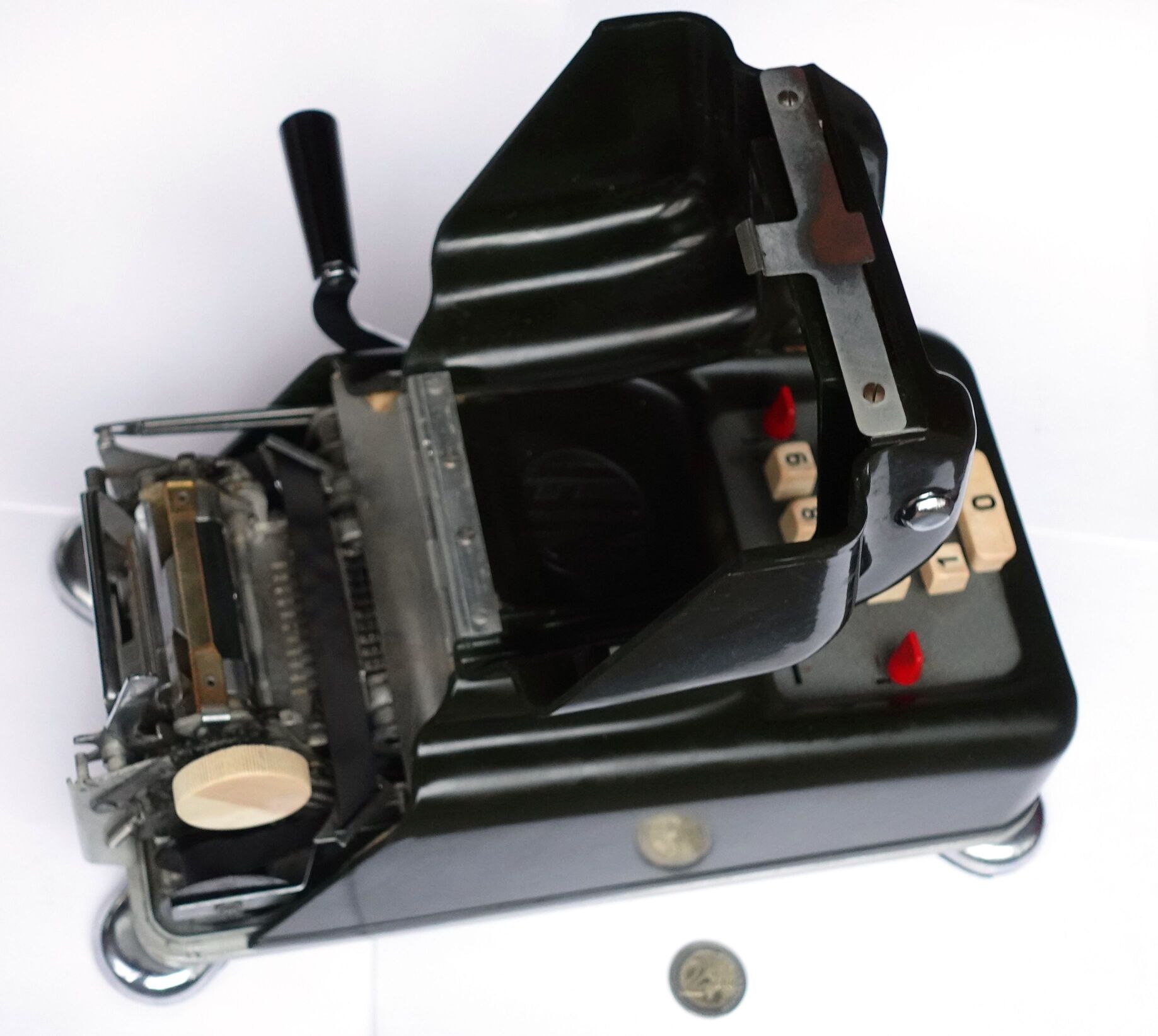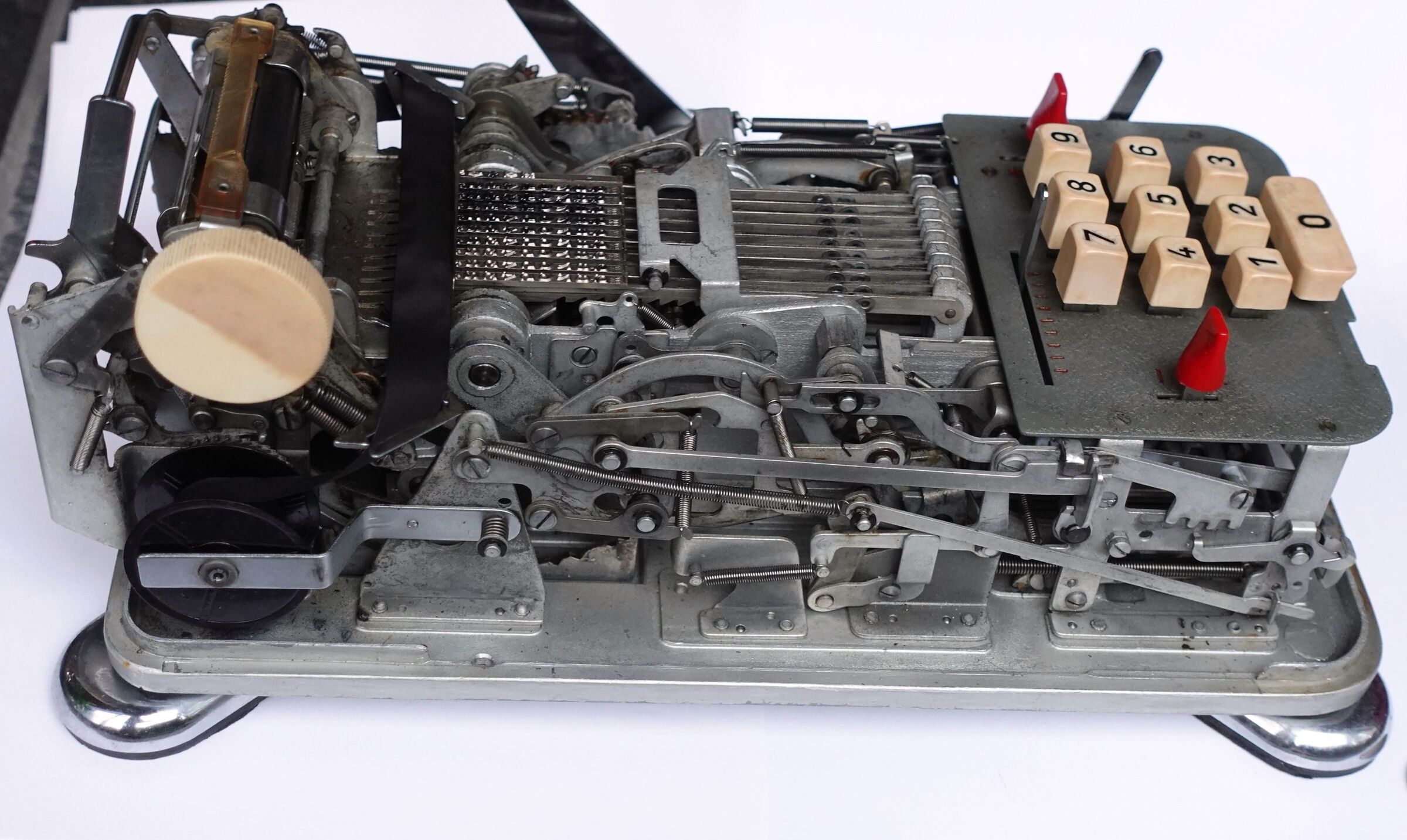 The serial number is 38,895, and it was made in about 1952. Most printing mechanisms on adding machines used vertical rods with the number type that is then hammered onto the paper. This adding machine was originally designed to fit into a briefcase, so the standard printing mechanism would make the machine too tall. Therefore the printing mechanism was changed to use horizontal rods instead, and the paper hammers down onto them. The main lever can also easily be removed.