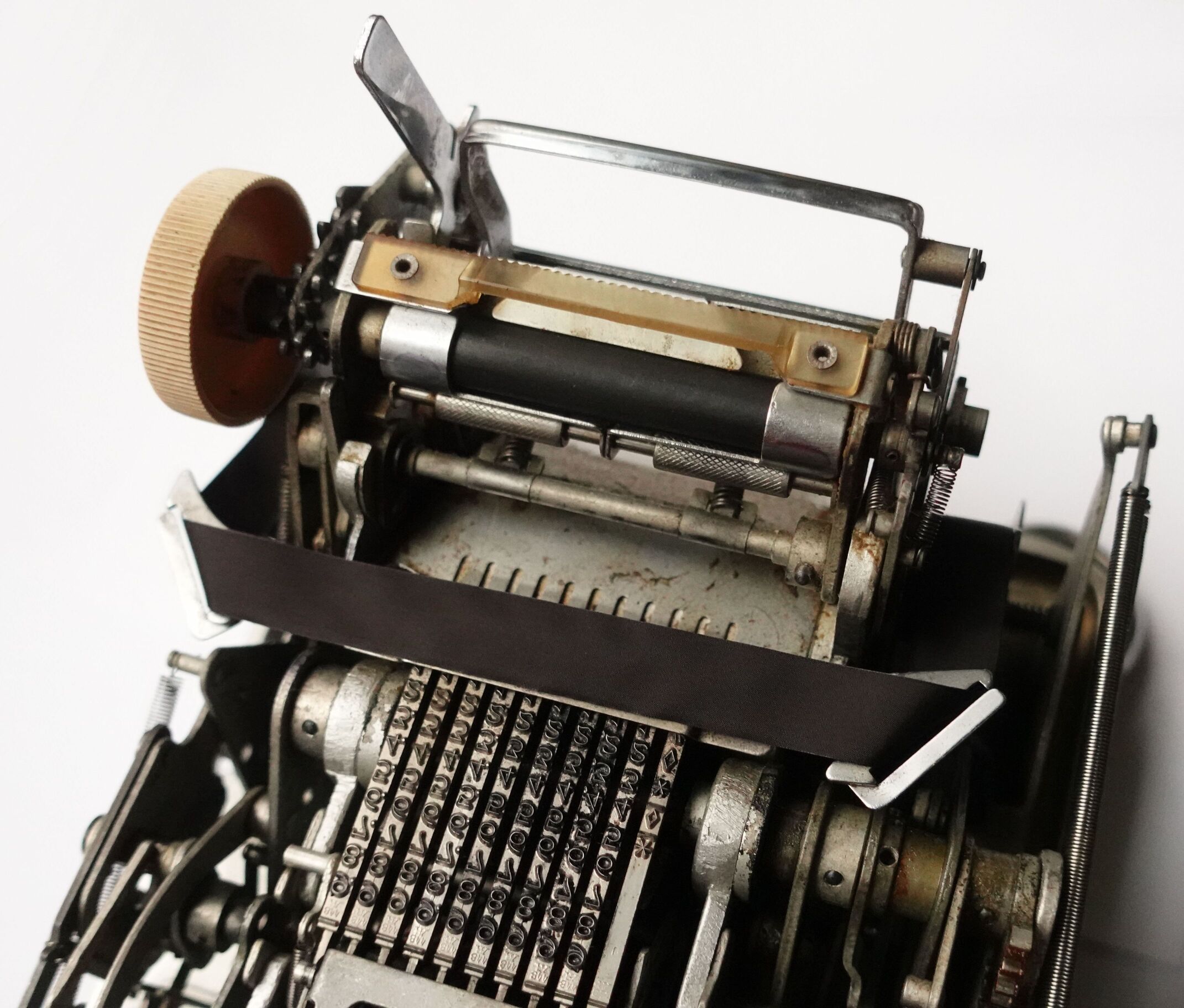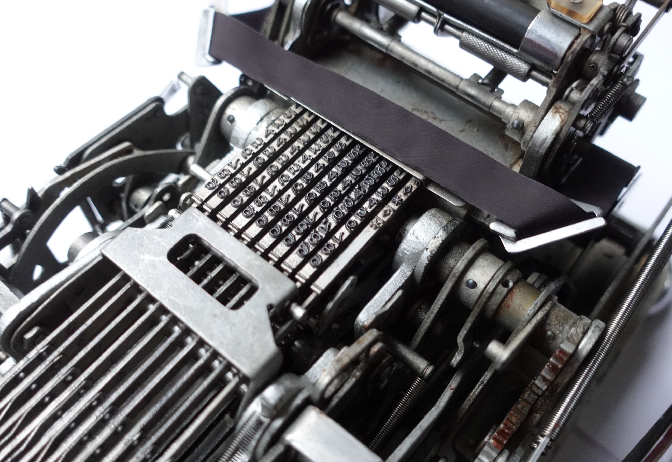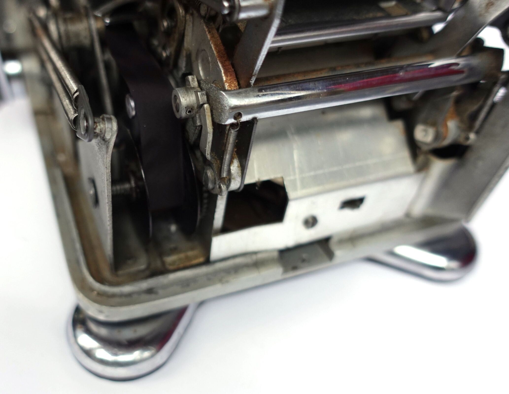 The serial number is 38,895, and it was made in about 1952. Most printing mechanisms on adding machines used vertical rods with the number type that is then hammered onto the paper. This adding machine was originally designed to fit into a briefcase, so the standard printing mechanism would make the machine too tall. Therefore the printing mechanism was changed to use horizontal rods instead, and the paper hammers down onto them. The main lever can also easily be removed.