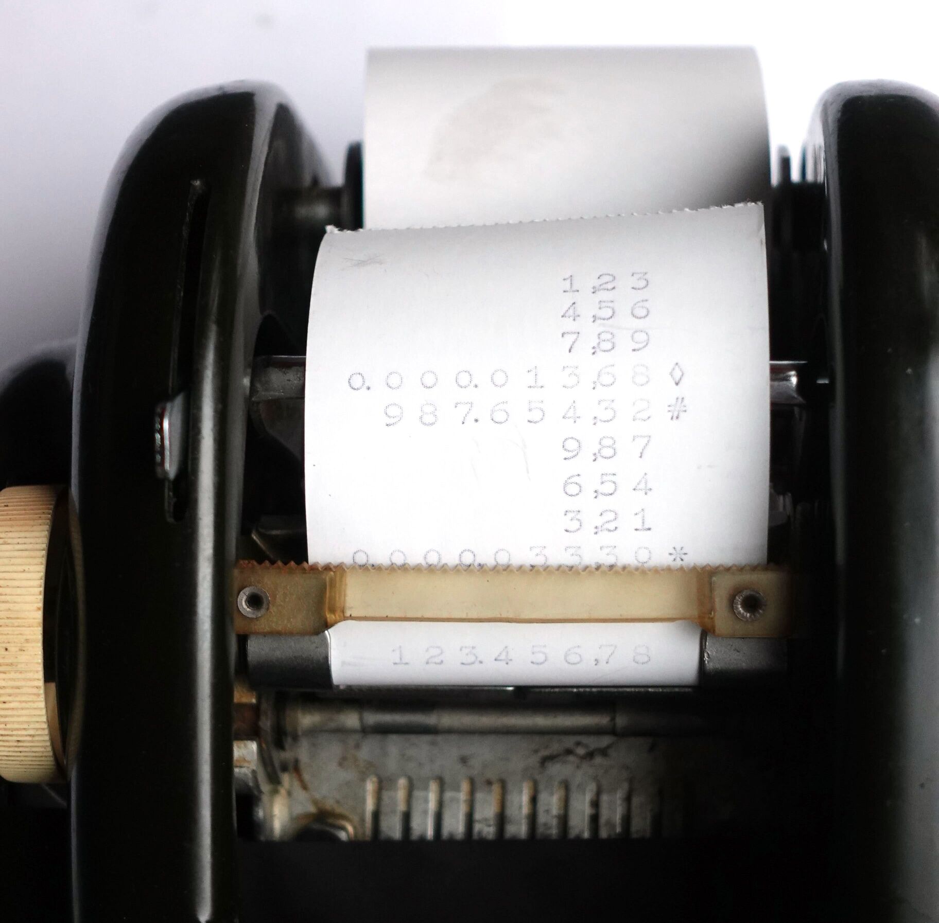 This is a manually driven machine, so every calculation or printing operation involves pulling the large lever forwards and then back. To add just type a number using the ten digit keys and pull the lever. This prints the number and adds it to the internal register. There is a two-way switch on the left that can be flipped to do subtraction or to do a non-add operation (just printing a number without adding it) with the next pull of the lever. The two-way switch on the right selects the total (printing and then clearing the internal register) or sub-total (just printing the internal register). Note that this switch may be blocked, in which case a blank pull of the lever has to be done before the total or subtotal can be printed.
