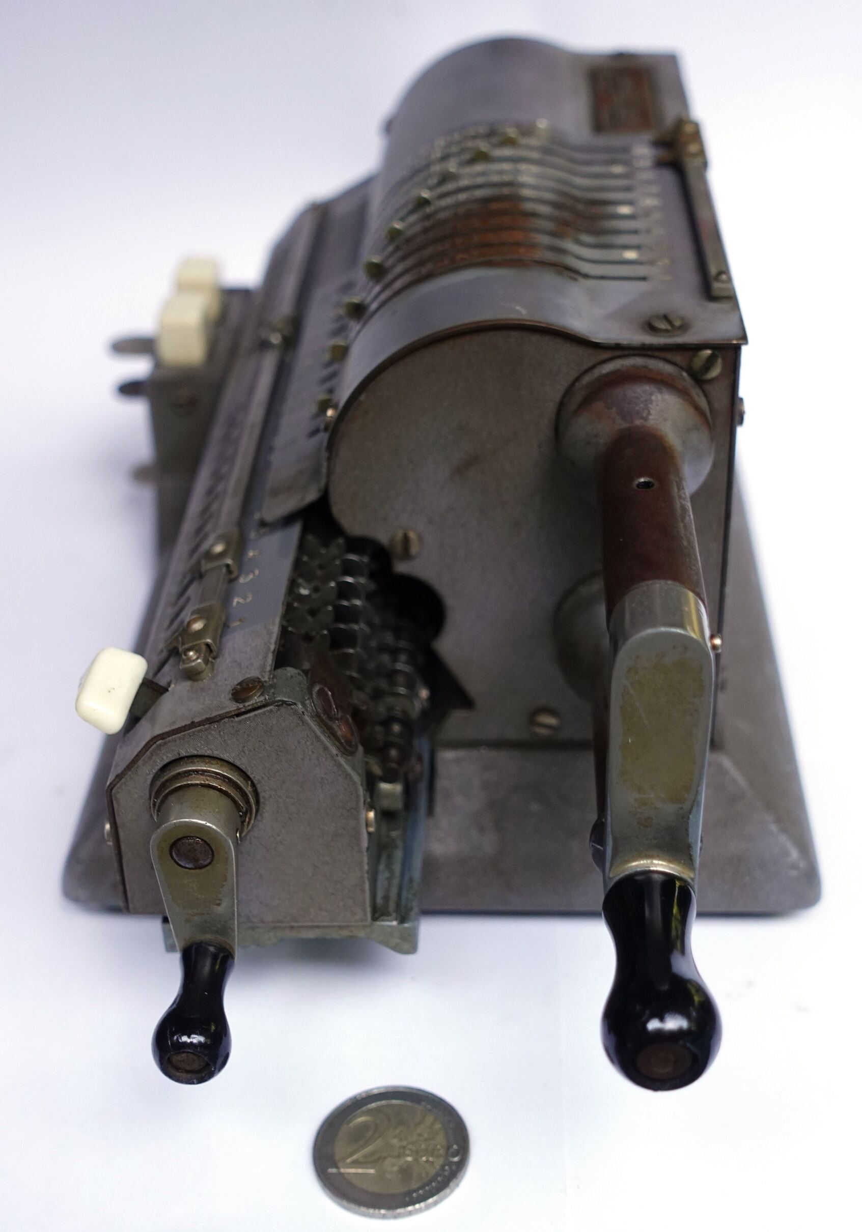 It has 9 input levers for entering a 9-digit input. It has a carriage on which there is a main register with a capacity of 13 digits, and a counter register with 8 digits. The counter does not have a carry mechanism, but shows red digits if turned in the negative direction. There is a bell that rings wheen an overflow or underflow occurs in the register, but it should be noted that carries only occur across 12 places so that the bell can only ring when the carriage is shifted one or more places to the right. This is a type Ag, where the A denotes the capacity and the g means it has an overflow bell.