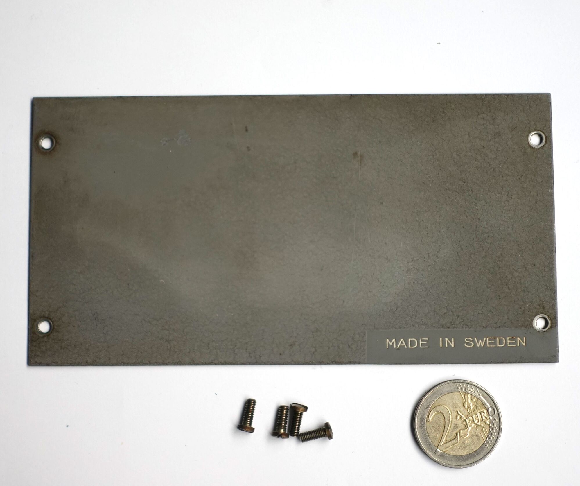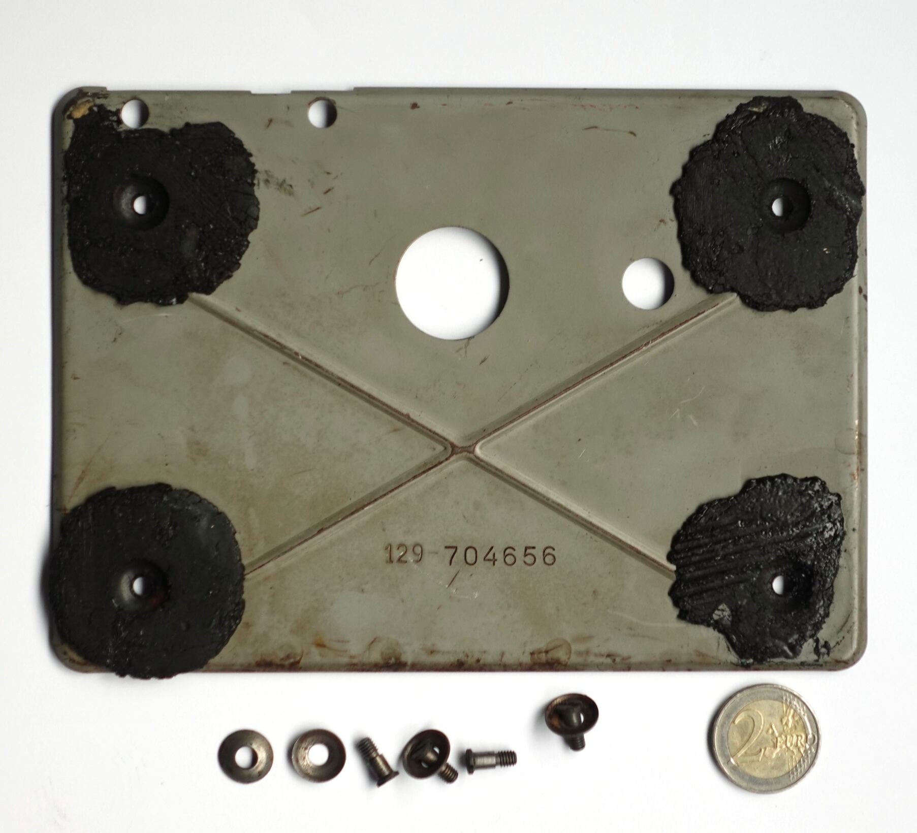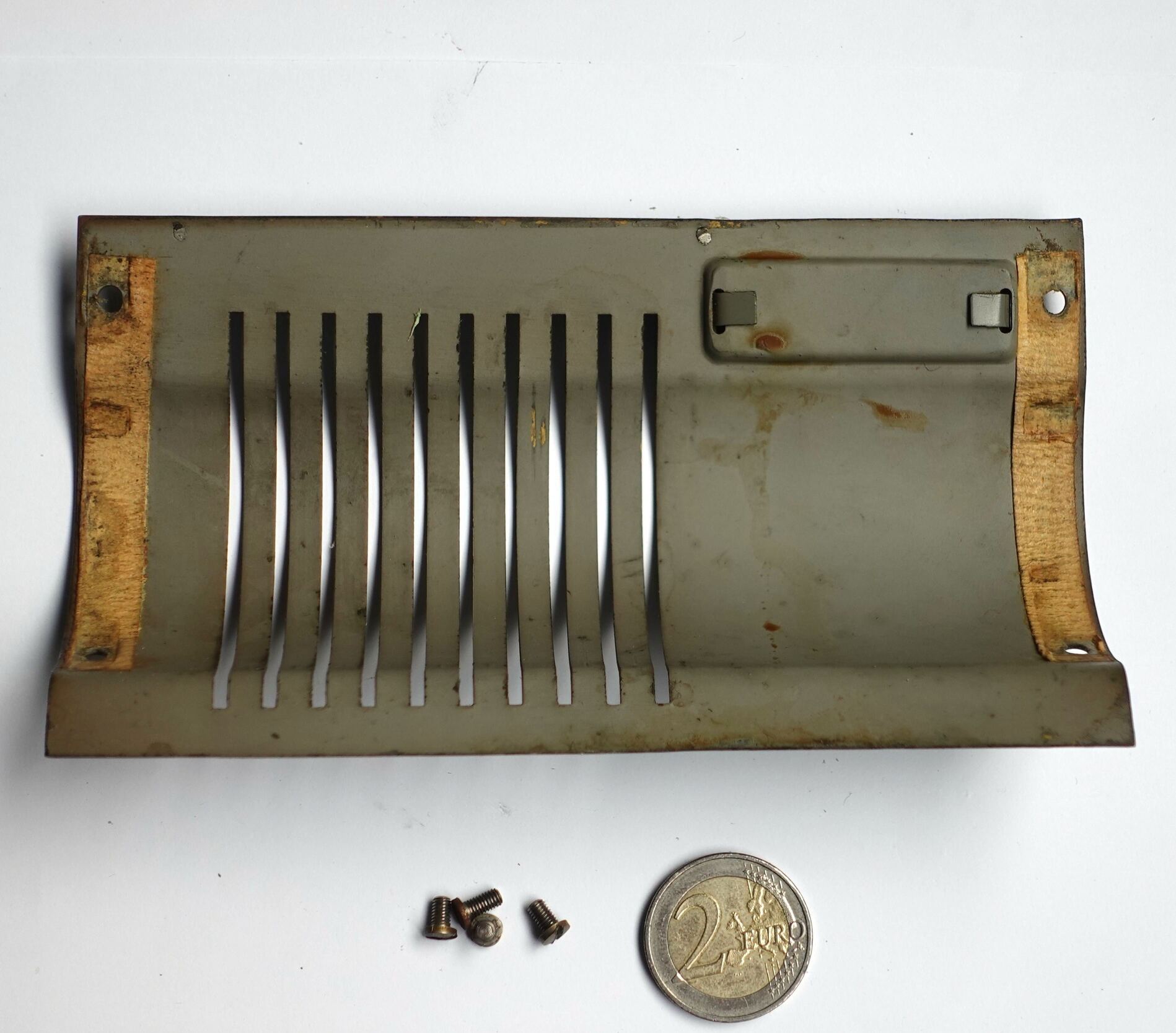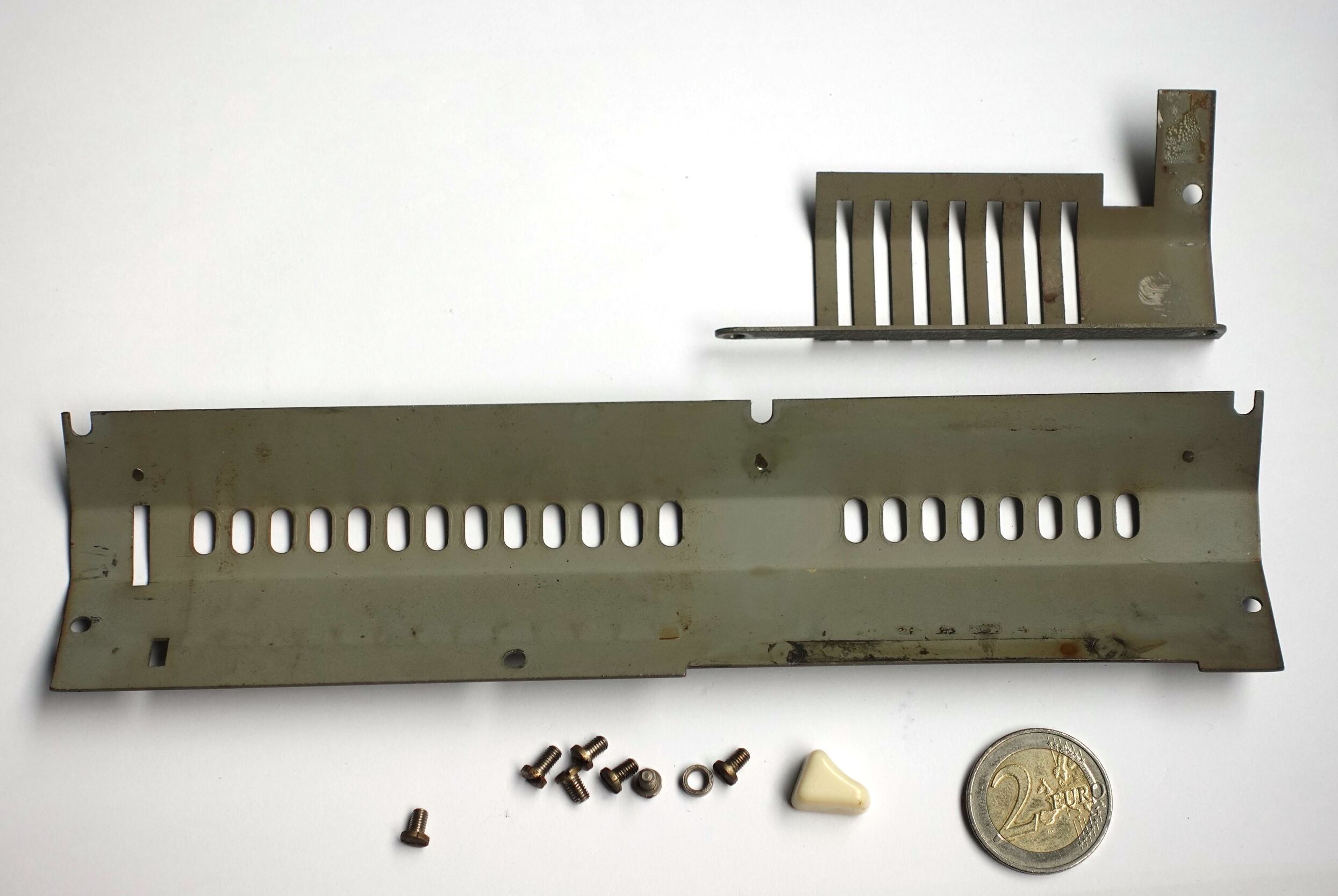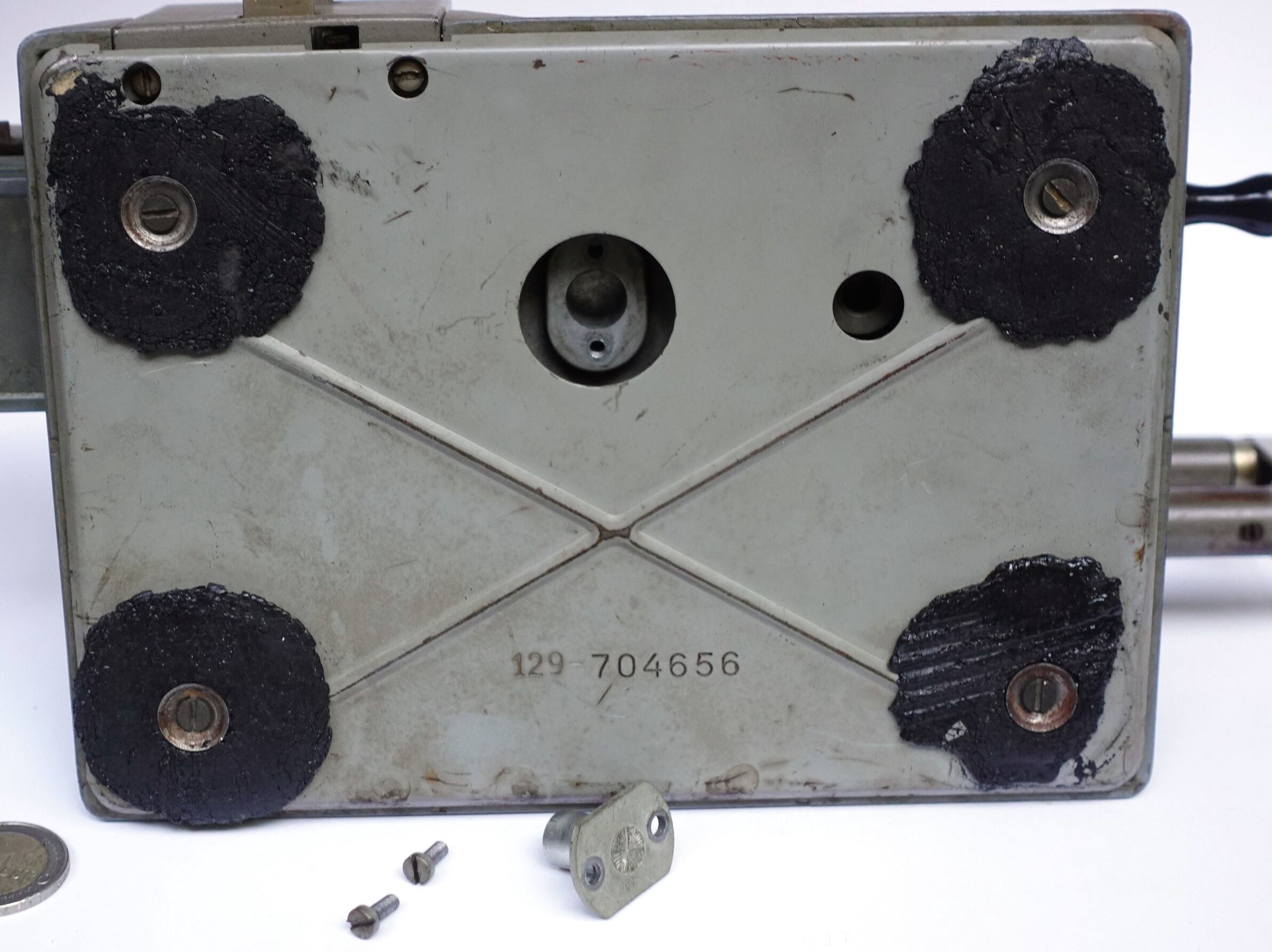 The serial number is 80203 which means it was made in 1968, though this model was in production from 1964 to about 1971. A section of the top cover lifts off to give access to the ink ribbon. The case is held closed by four screws. The mechanism rests on the rubber feet that stick through the base of the case in order to reduce noise and vibration. Unfortunately most of the rubber feet have degraded and collapsed so that the mechanism now rests directly on the surface of the underlying desk.
