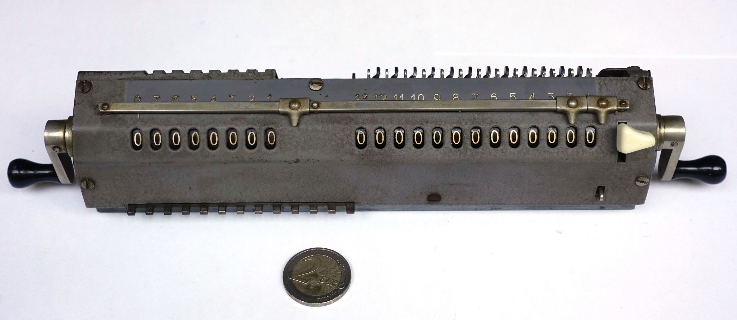 The Original-Odhner 24 is a mechanical calculator with a pinwheel mechanism. It has 10 input levers for entering a 10-digit input. It has a carriage on which there is a main register with a large capacity of 20 digits, and a counter register with 11 digits. The counter has a carry mechanism. The input can be cleared by pushing a button on the right which closes the input lever slots, after which you can turn the crank clockwise as far as it will go which causes the input pins to be pushed up, and then returning the crank to its resting position.