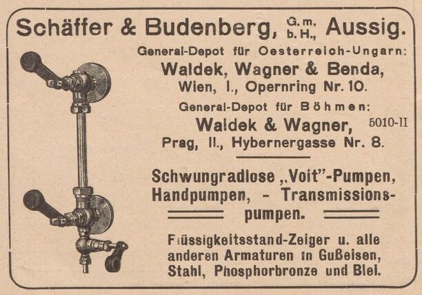 Schäffer & Co was founded in 1850 in Magdeburg by the engineer Bernhard Schäffer, the merchant Christian Friedrich Budenberg and others. Within 2 years those others left, and the company name was changed to Schäffer & Budenberg. Schäffer had developed a pressure gauge, patented in 1849, which the company began to manufacture. The company grew and in 1859 relocated to Buckau, on the outskirts Magdeburg, which were larger premises with adjacent land that allowed for future expansion possibilities. Buckau was already home to Maschinenfabrik Buckau R. Wolf, which made steam engines.