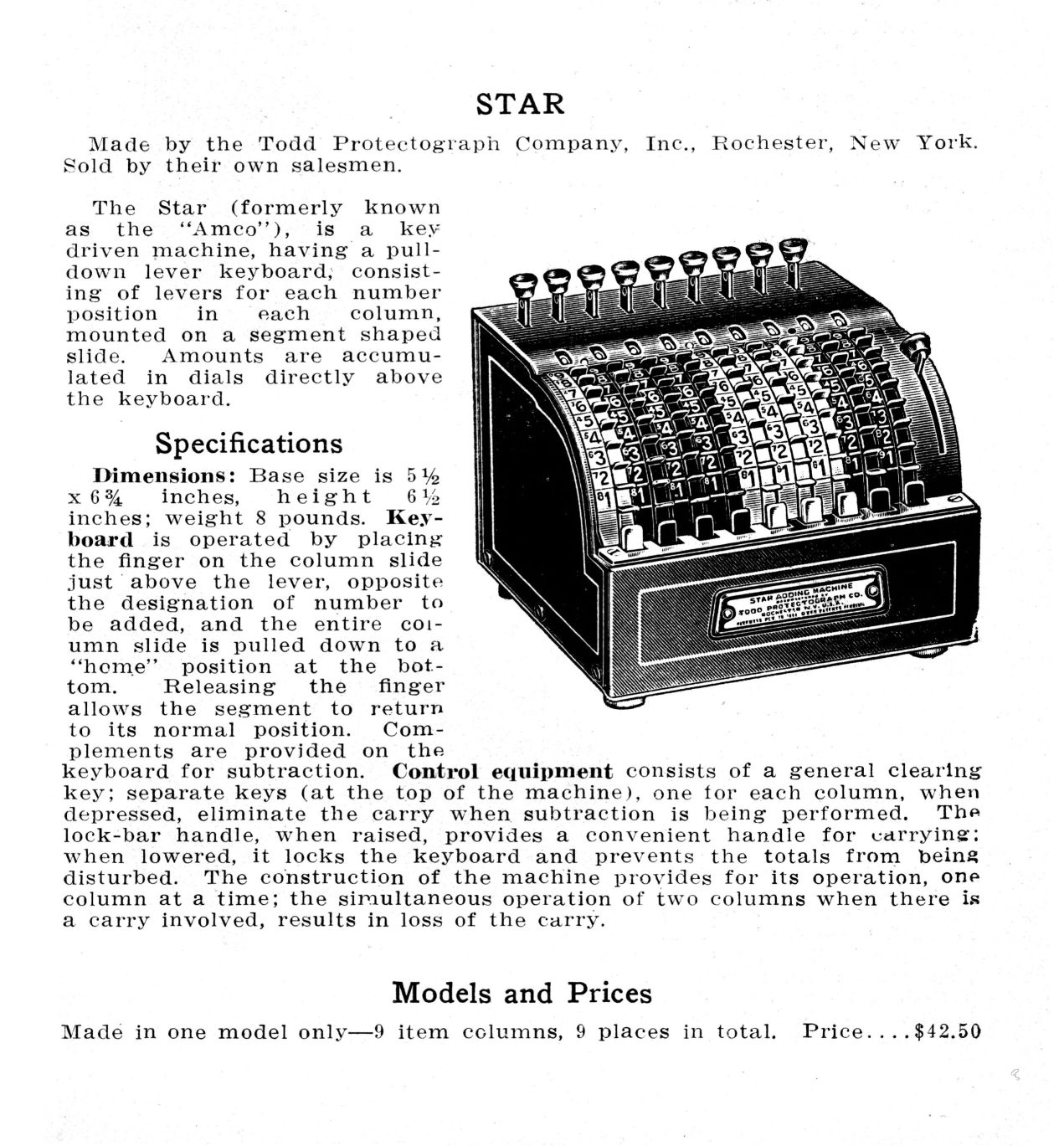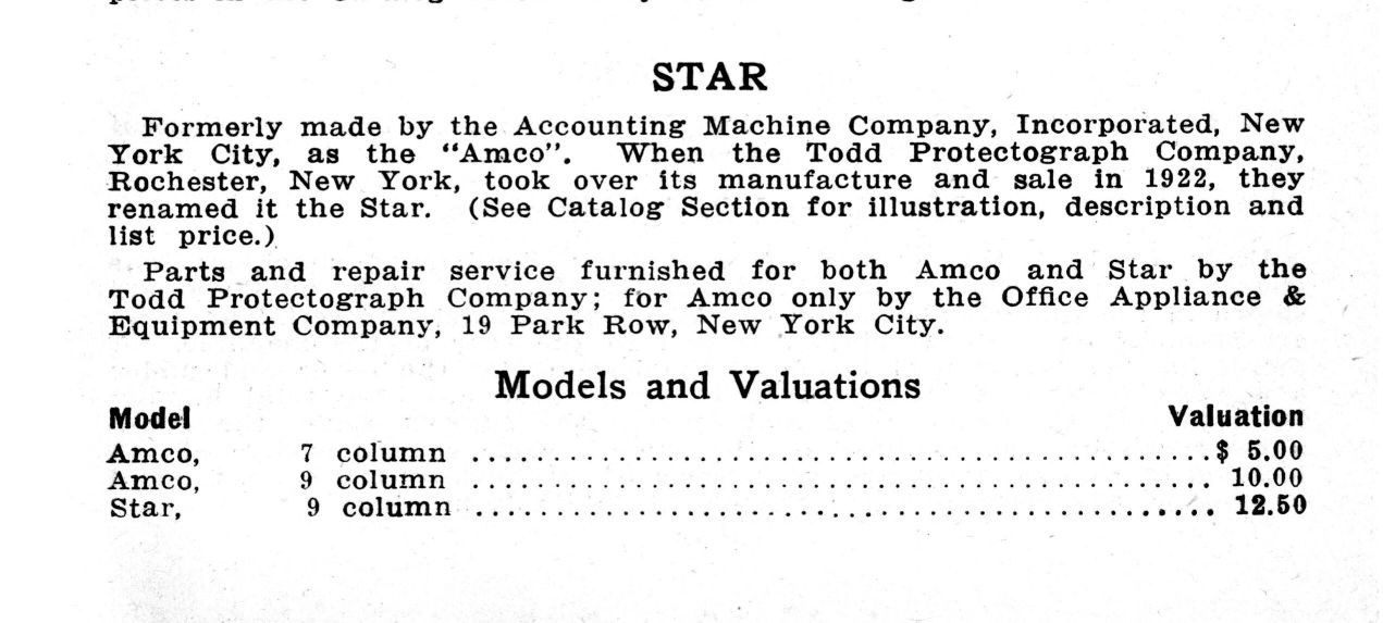 | 1922-1923 | Star Adding Machine | Made by Todd Protectograph Company. Identical to the AMCO, apart from the label.