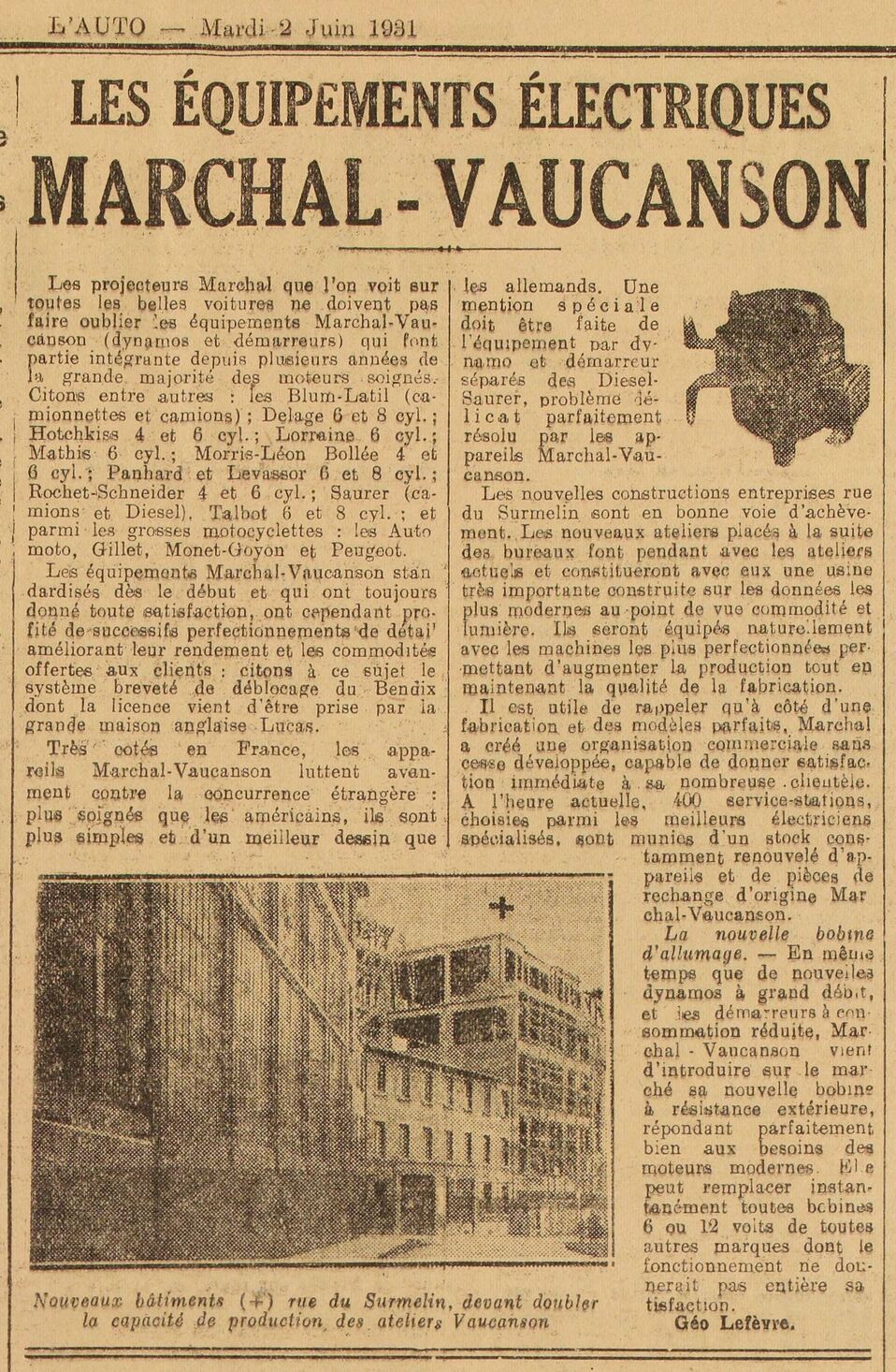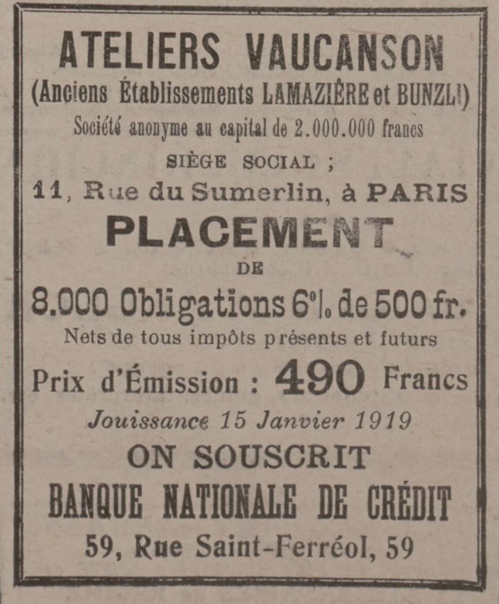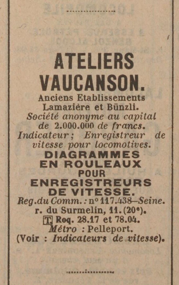 Ateliers Vaucanson was founded in 1914 in Saint Nicolas D'Aliermont, France. Manufacturing was done at Saint Nicolas, but the head office was at 11 Rue de Surmelin in Paris. The company is named after Jacques de Vaucanson (1709-1782), who was an inventor who designed many machines (an all-metal lathe, an automatic loom) that powered the industrial revolution, but is best remembered for his music boxes and incredible automata such as the Digesting Duck. Ateliers Vaucanson was really the successor to Lamazière & Bünzli, which had operated from the same addresses since at least 1909.