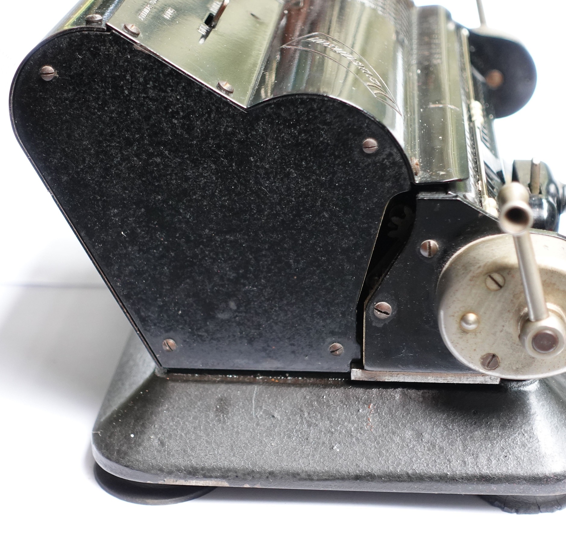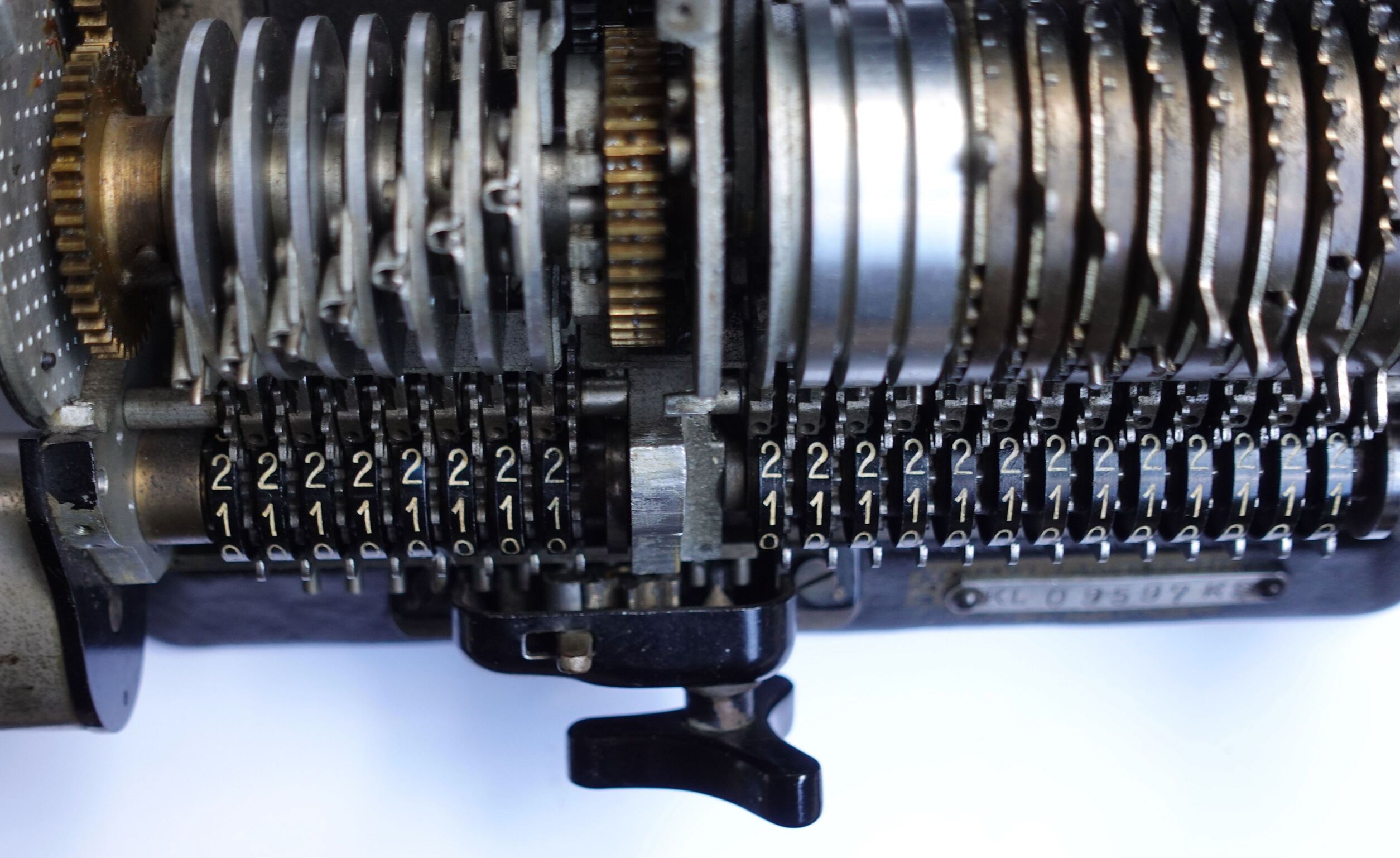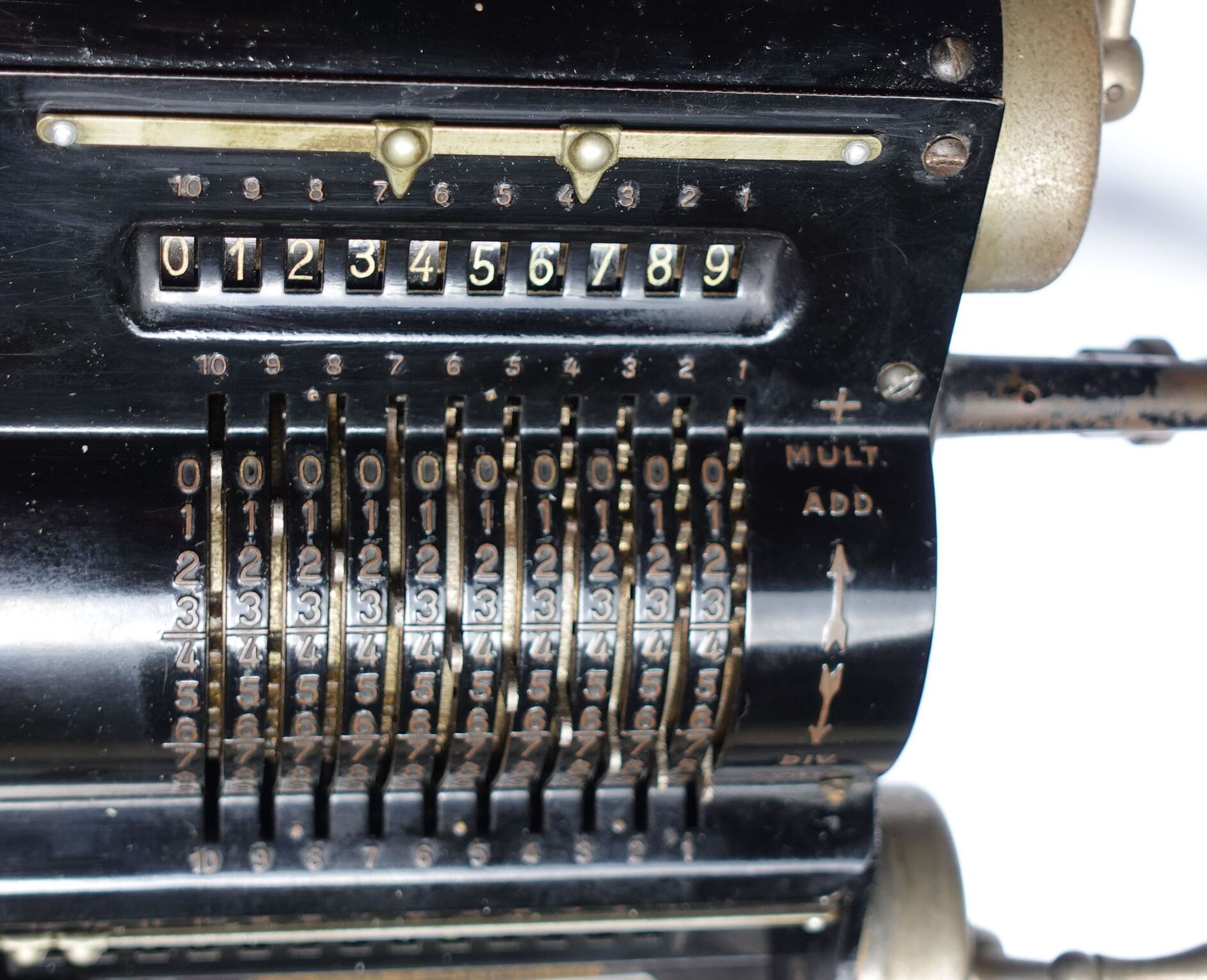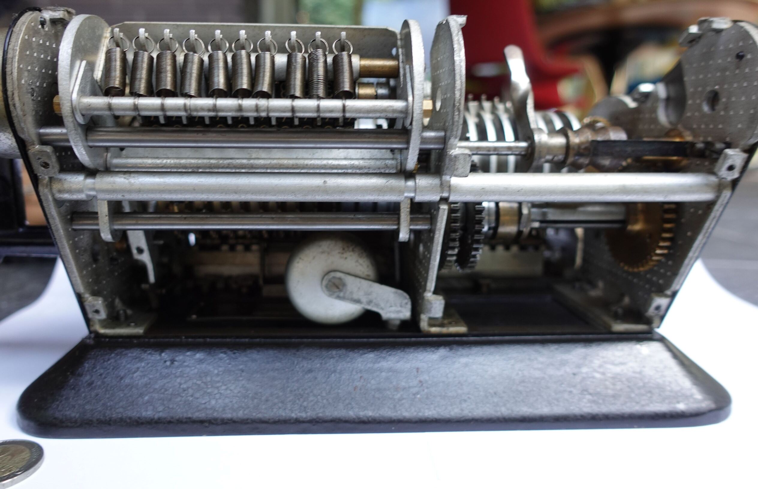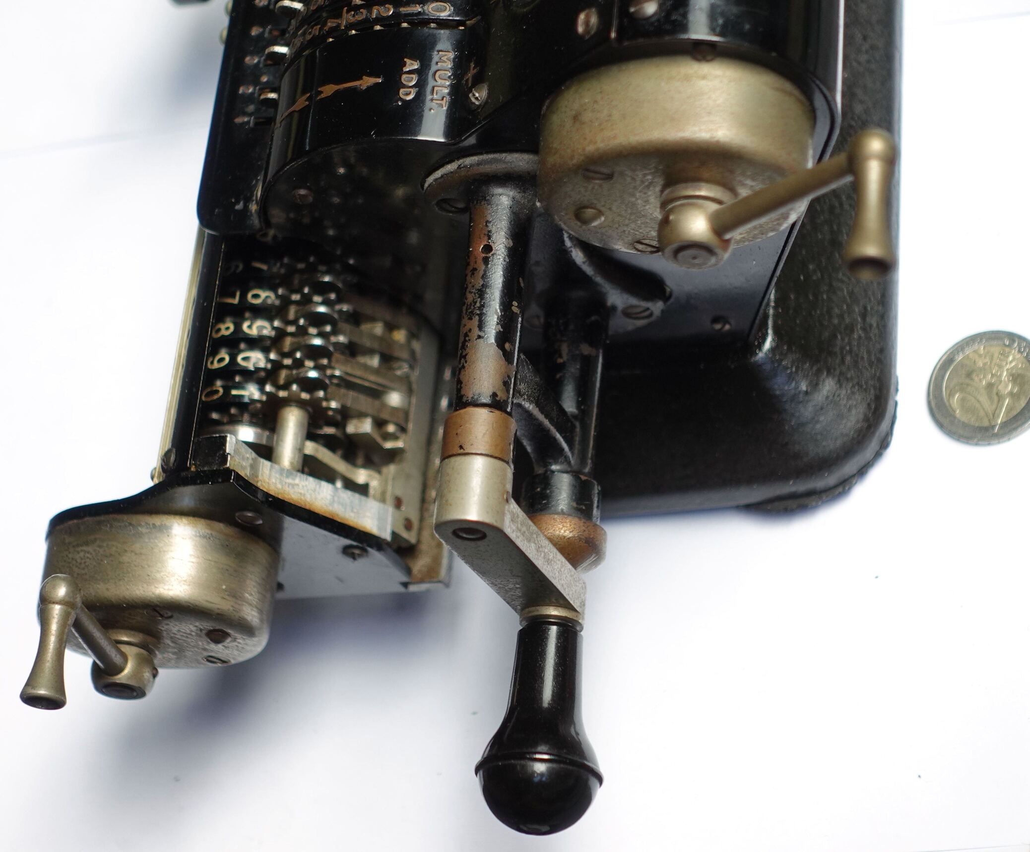 The Vaucanson A.V.A. 13 is a pinwheel calculator made in France. The case has a very distinctive backwards-leaning shape. It has 10 digits of input, an 8-digit counter, and 13 digits in the register. All three registers have a clearing lever. The counter has a carry mechanism, and there is a switch to select whether it counts additions or subtractions.