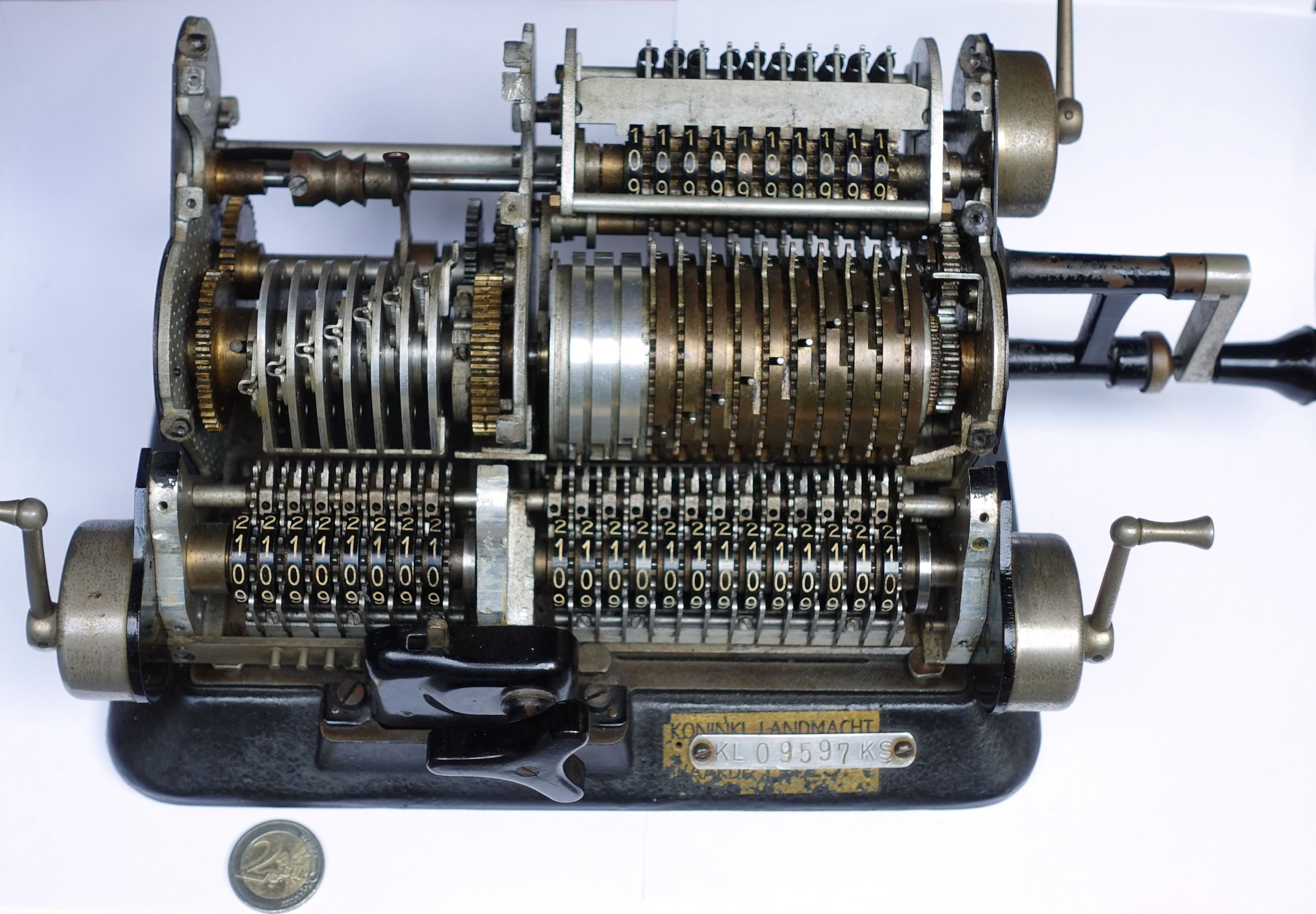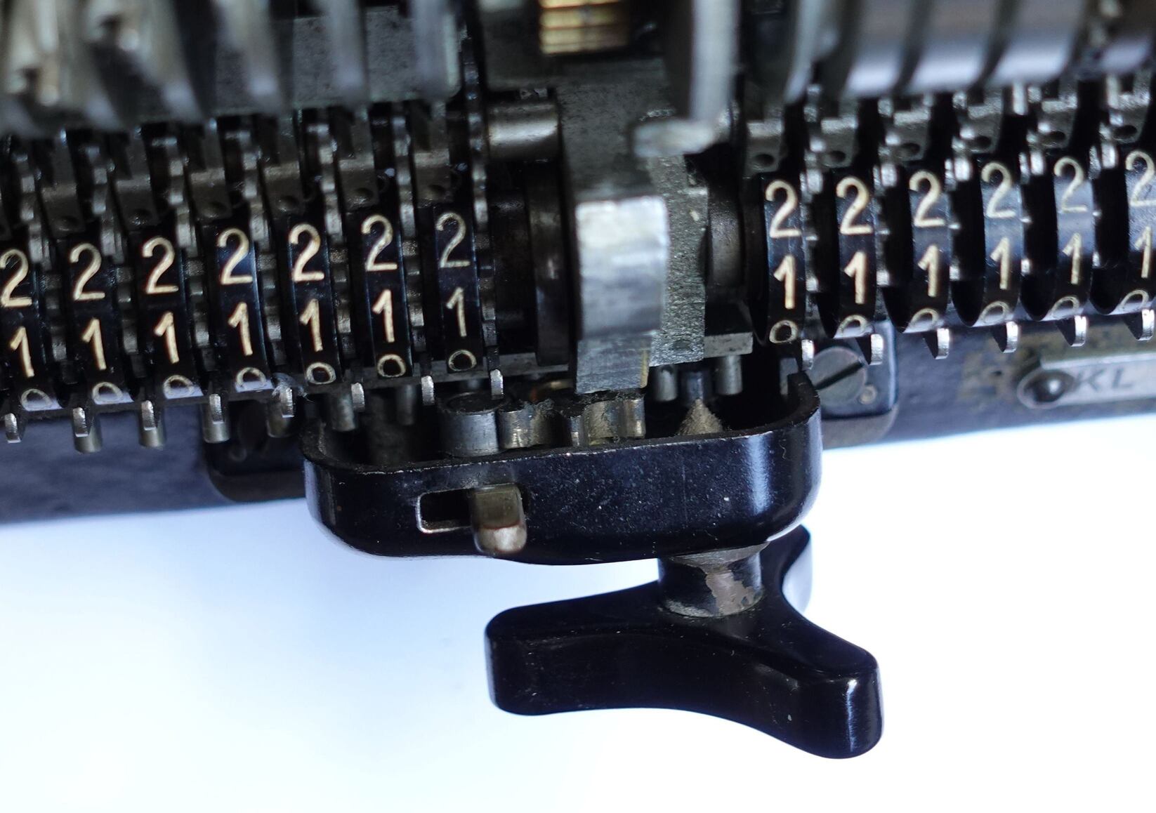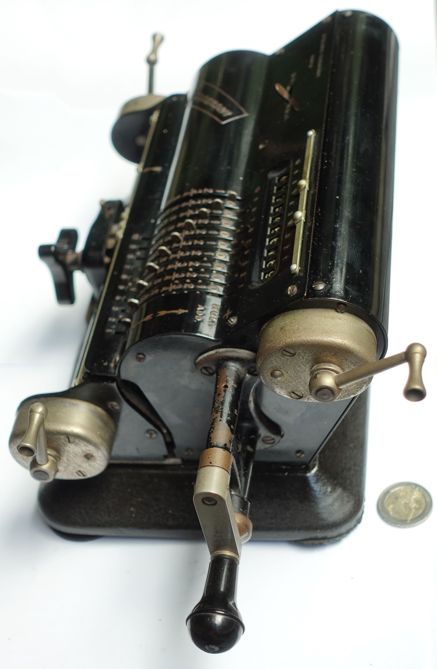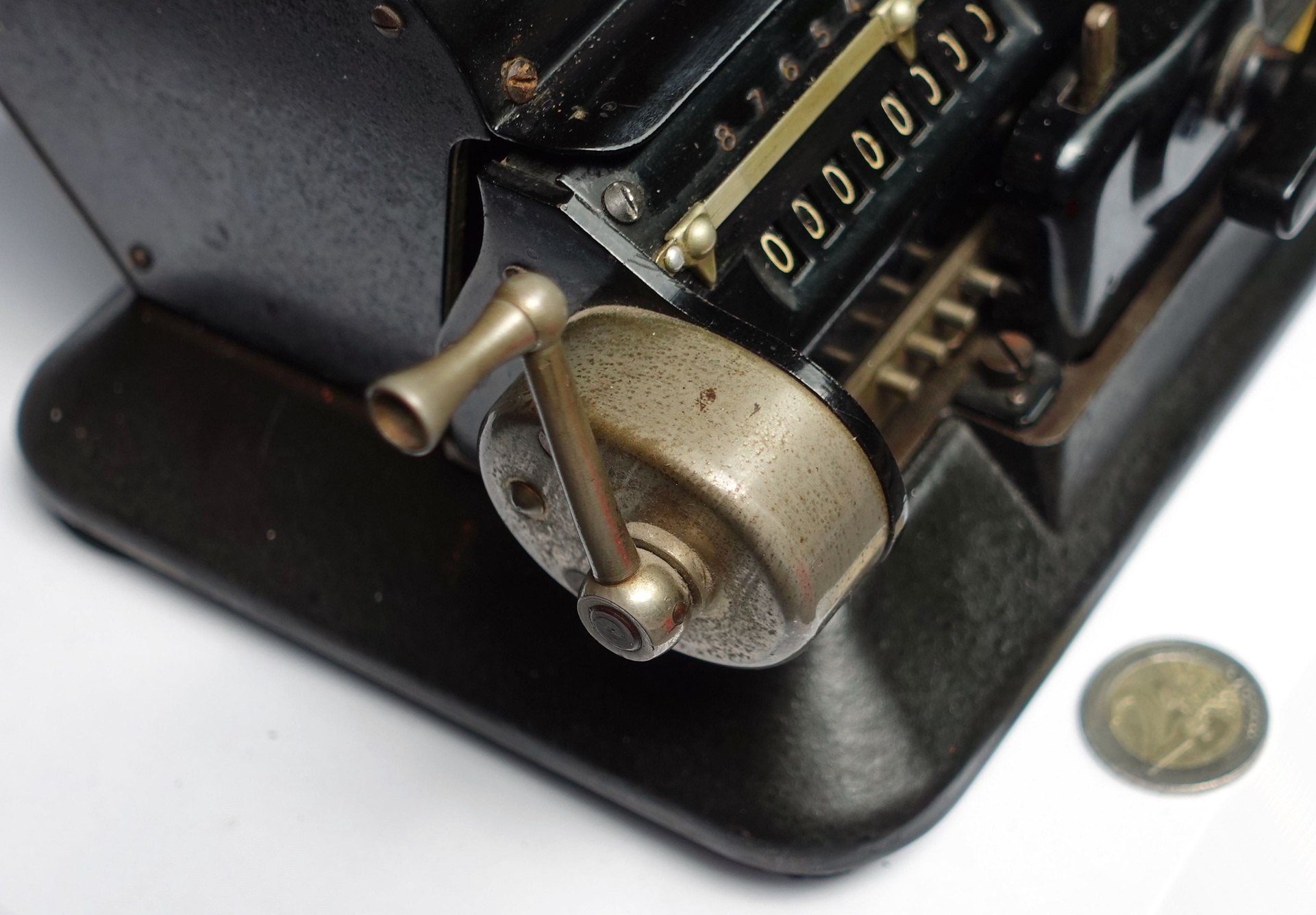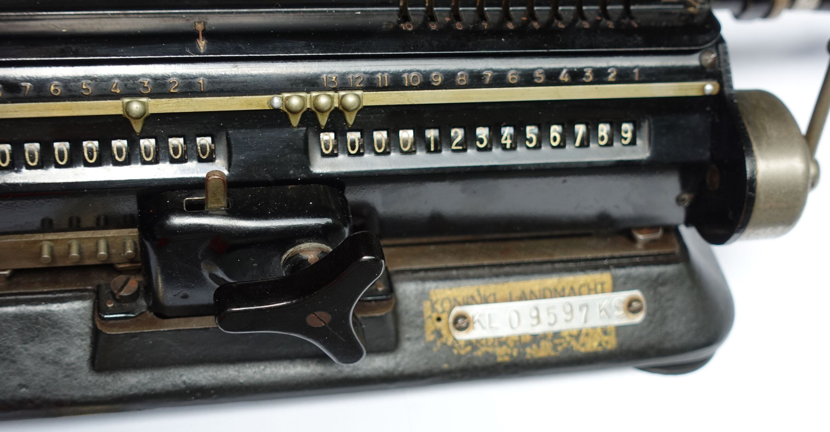 On the front of the base there would usually be a plaque from the distributor or supplier. In its place this calculator has a decal bearing the text "Koninklijke Landmacht, Waarde ƒ425,--", meaning it was used in the (Dutch) royal army, and had a value of 425 guilders. On top of this is a tag with the army's inventory number for this machine. According to the seller, it was used at the Havenkazerne in Schoonhoven by the Regiment van Heutsz.