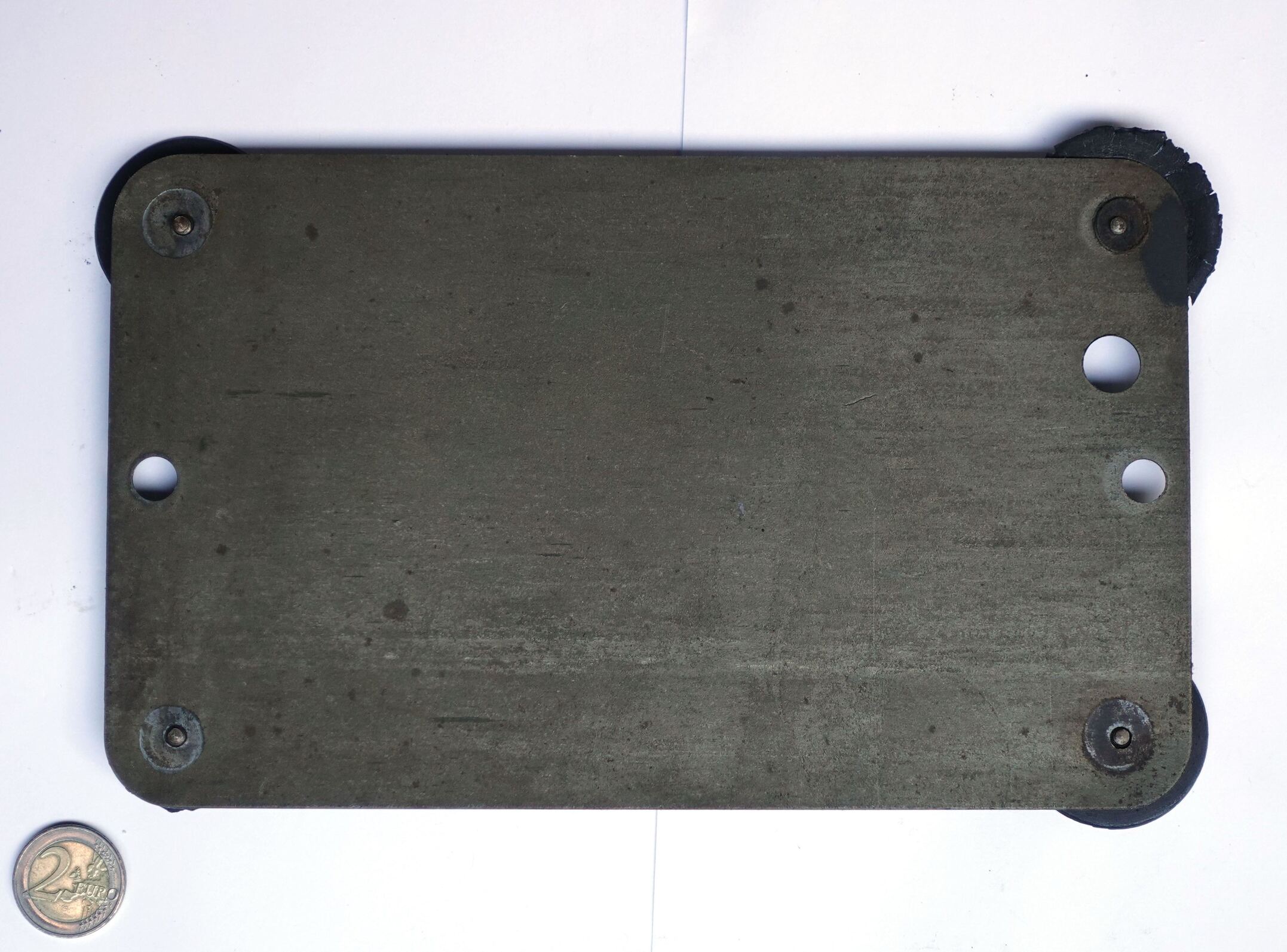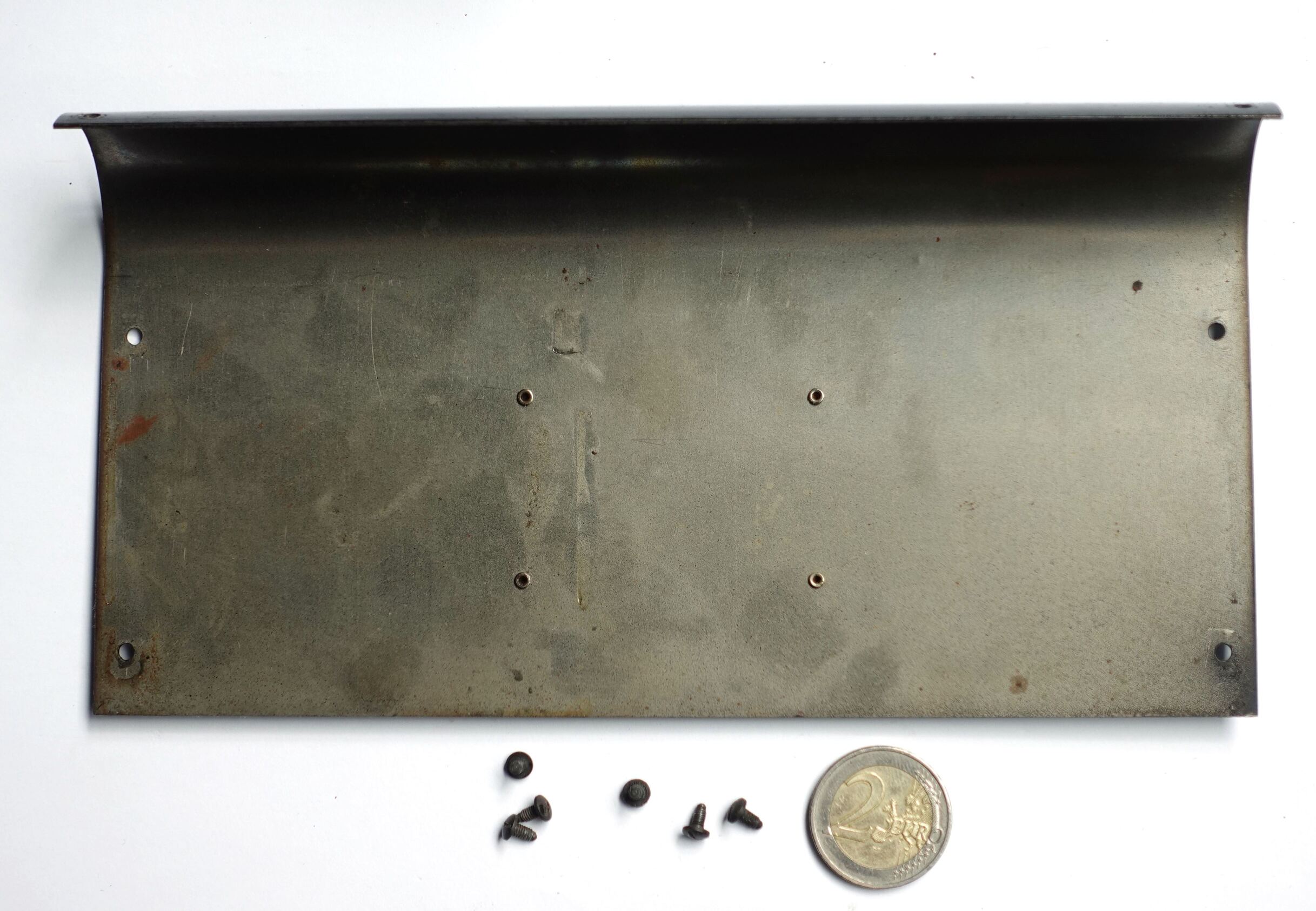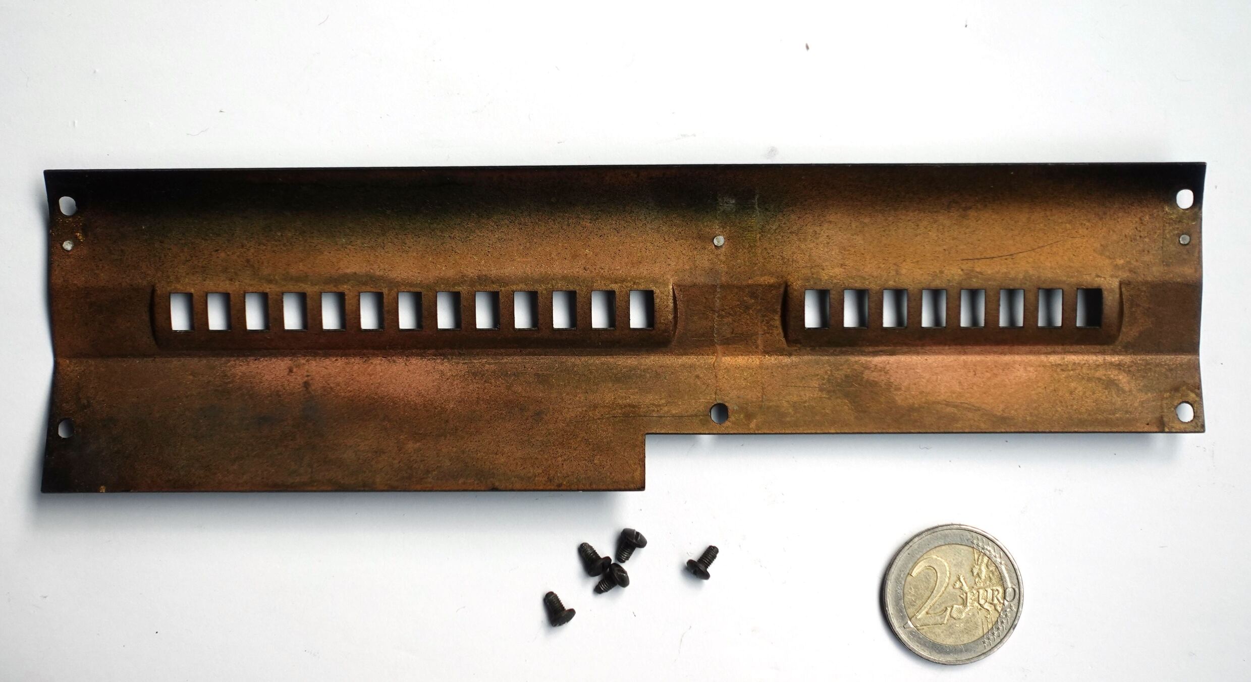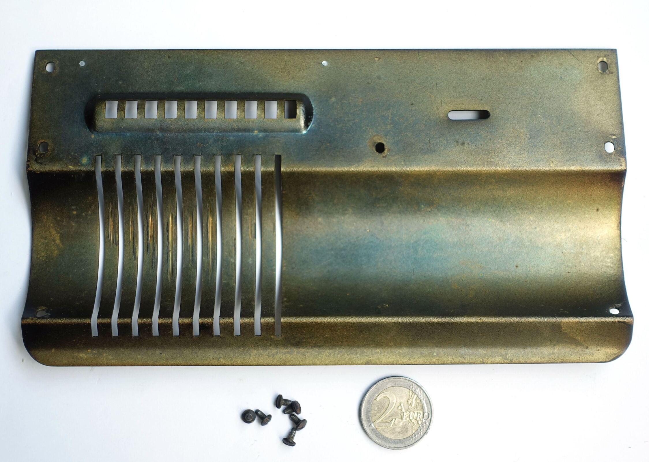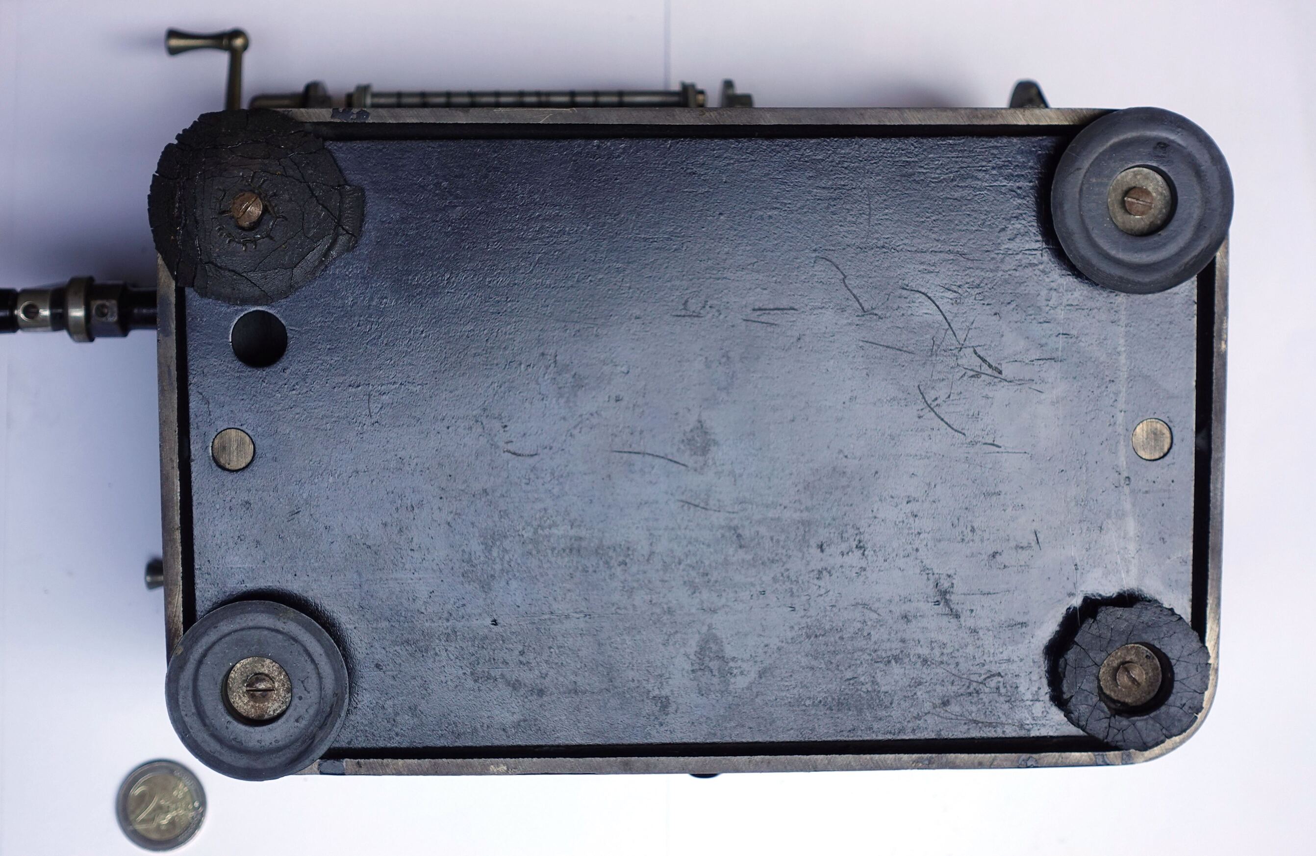 On the front of the base there would usually be a plaque from the distributor or supplier. In its place this calculator has a decal bearing the text "Koninklijke Landmacht, Waarde ƒ425,--", meaning it was used in the (Dutch) royal army, and had a value of 425 guilders. On top of this is a tag with the army's inventory number for this machine. According to the seller, it was used at the Havenkazerne in Schoonhoven by the Regiment van Heutsz.