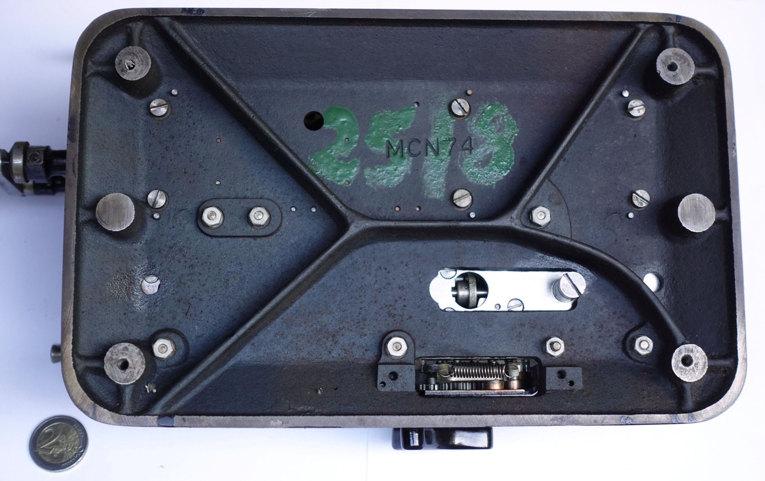 The plaque on the back of the case has the model (A.V.A. 13), the variant (102 AB), and the serial number (27,196). It is unclear what the variant number indicates, but I think the last digit may be the paint colour. It was probably made in around 1950. There is a second plaque on the base inside the machine that also bears the serial number.